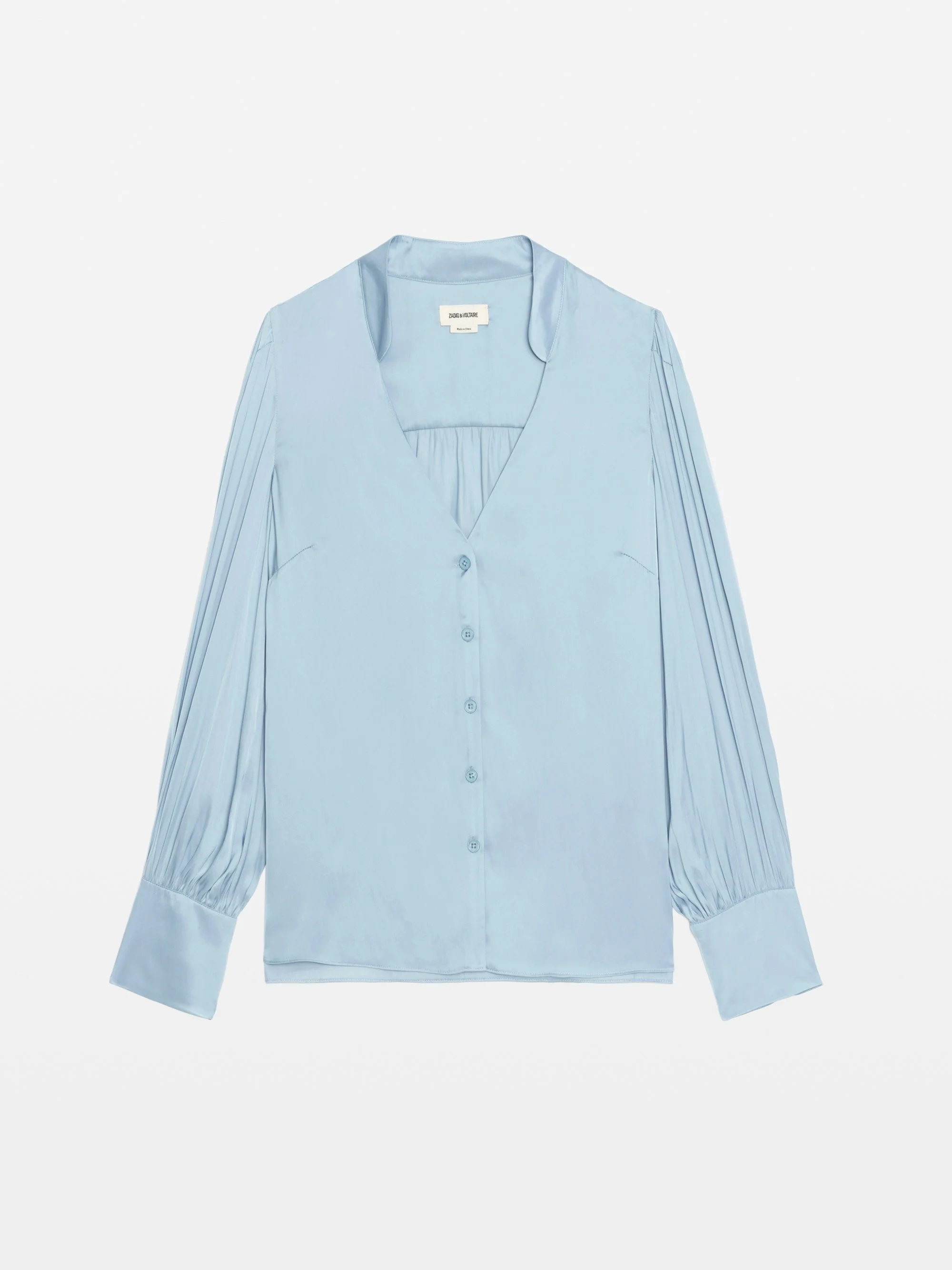 Long-sleeved V-neck satin shirt with cuffs with diamante jewelled buttons. Description & details - Women's satin shirt - V neck and button fastening - Long, full sleeves and fitted cuffs with diamante buttons - Slightly pleated effect in the back and small slits on the sides This item is true to size. We recommend buying your usual size. Composition 51% Polyester* 49% Polyester Care - Hand-wash or machine-wash inside out in a mesh laundry bag on a 20°C delicate cycle with a maximum spin speed of 400 rpm - Air dry flat - Iron inside out at a maximum of 110°C Product code: WWSH00572_SKY