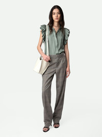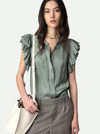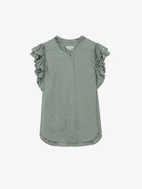 Khaki satin short-sleeved top with ruffles and gathers. Description & details - Women’s Treillis khaki flowing satin top - Round neckline - Buttoned and pleats at the back - Gathered, ruffled short sleeves Model is 178 cm / 5' 10" and is wearing a size S This item is true to size. We recommend buying your usual size. Composition 57% POLYESTER** 43% POLYESTER Care - Hand-wash or machine-wash inside out in a mesh laundry bag on a 20°C delicate cycle with a maximum spin speed of 400 rpm - Air dry flat - Iron inside out at a maximum of 110°C Product code: WWTO00197_TREILLIS
