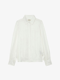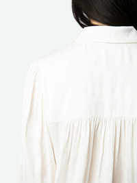 Long-sleeved white satin blouse with buttoned V-neck and gathered shoulders. Description & details - Women's white satin flowy blouse - Buttoned V neck and gathered shoulders - Pleats in the back - Long sleeves and buttoned cuffs This item is true to size. We recommend buying your usual size. Composition 57% Polyester** 43% Polyester Care - Hand-wash or machine-wash inside out in a mesh laundry bag on a 20°C delicate cycle with a maximum spin speed of 400 rpm - Air dry flat - Iron inside out at a maximum of 110°C Product code: WWSH00583_JUDO