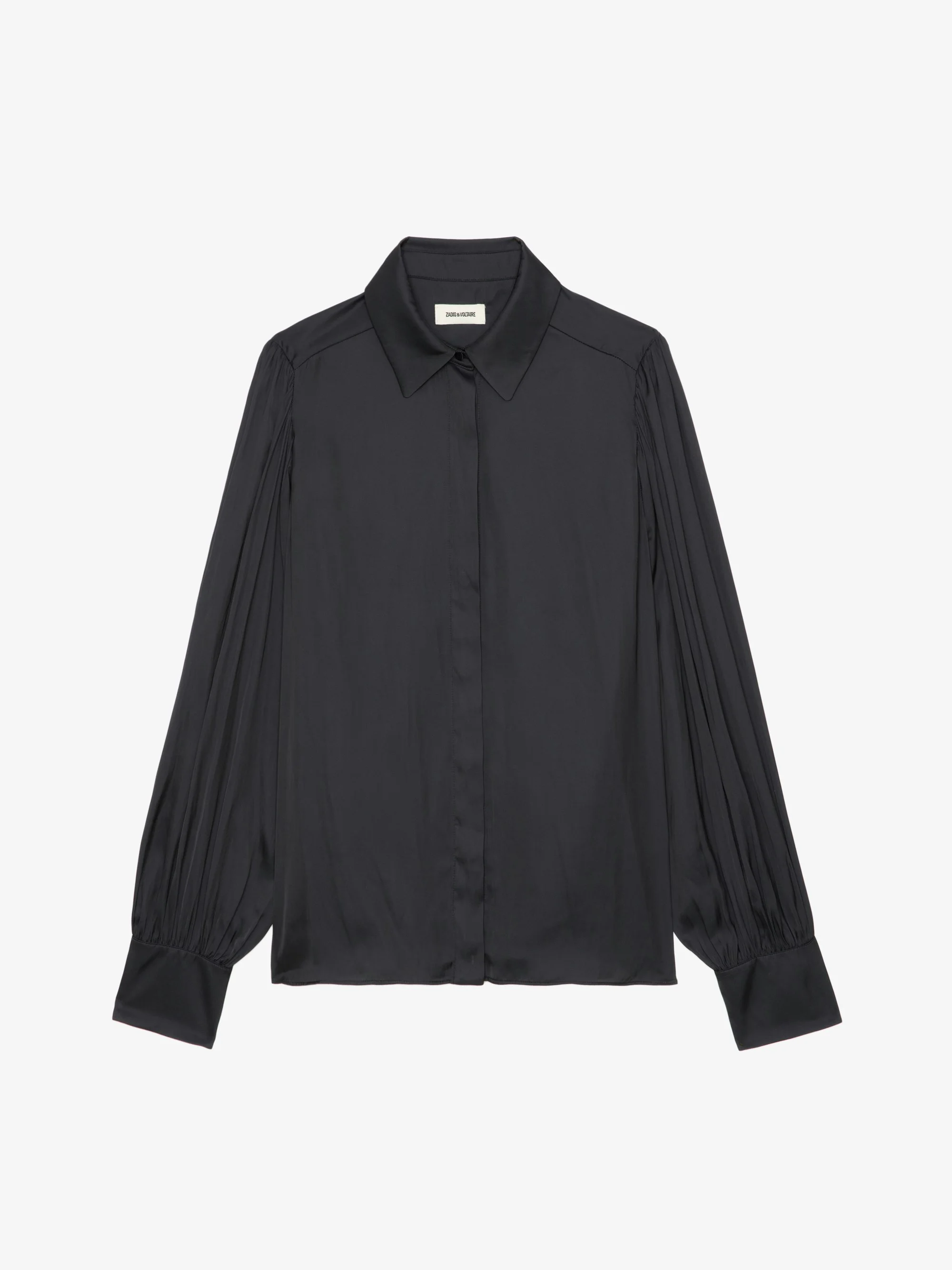 Long-sleeved black satin blouse with buttoned V-neck and gathered shoulders. Description & details - Women's black satin flowy blouse - Buttoned V neck and gathered shoulders - Pleats in the back - Long sleeves and buttoned cuffs Model is 174 cm / 5' 8" and is wearing a size S This item is true to size. We recommend buying your usual size. Composition 57% Polyester** 43% Polyester Care - Hand-wash or machine-wash inside out in a mesh laundry bag on a 20°C delicate cycle with a maximum spin speed of 400 rpm - Air dry flat - Iron inside out at a maximum of 110°C Product code: WWSH00583_NOIR