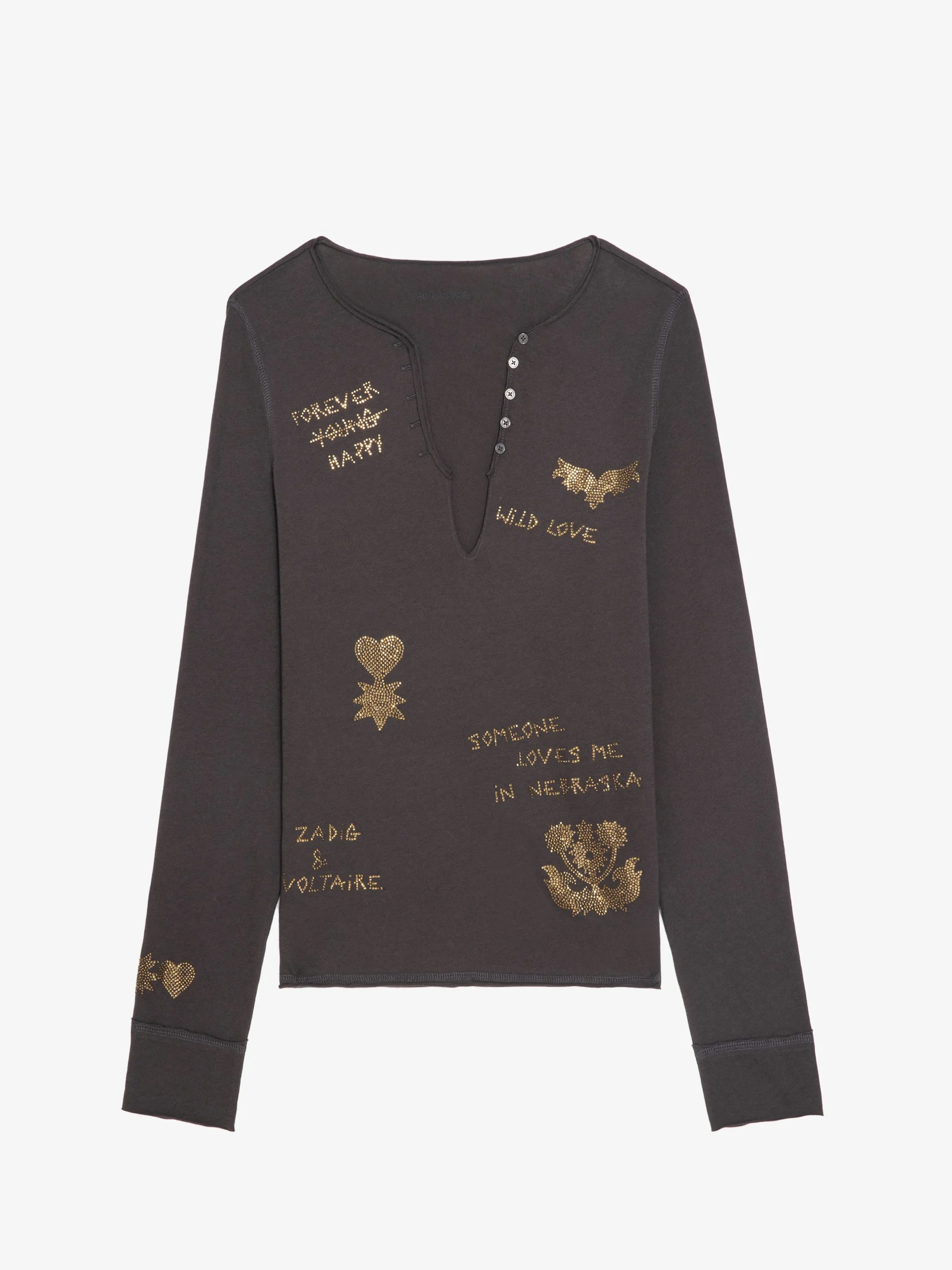 Long-sleeved henley t-shirt with multi-crystal embellishment. Description & details - Henley t-shirt T-shirt in 100% cotton - Henley t-shirt collar with 5 buttons - Crystal print on front and back - Long sleeves Model is 177 cm / 5' 9" and is wearing a size S This item fits true to size. Choose your usual size. Composition 100% Cotton** Care - Machine-wash inside out on a 30°C delicate cycle with similar colours - Air dry - Iron inside out at a maximum of 110°C, avoiding any customised details Product code: JWTN02643_DARK CHOCOLATE