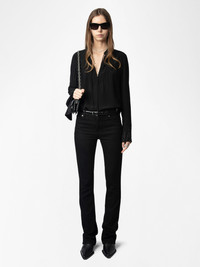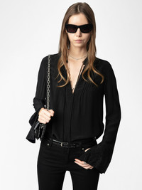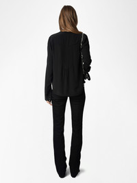 Viscose blouse with rhinestone patterns on cuff, long sleeves. Description & details - Blouse - Open collar and tie fastenings - Gathered details and pleats at the back - Long sleeves and slit cuffs adorned with rhinestones Model is 176 cm / 5' 9" and is wearing a size S This item is true to size. We recommend buying your usual size. Composition 100% Viscose Care - Hand-wash or machine-wash inside out in a mesh laundry bag on a 20°C delicate cycle with a maximum spin speed of 400 rpm - Air dry flat - Iron inside out at a maximum of 110°C Product code: WWSH02217_BLACK