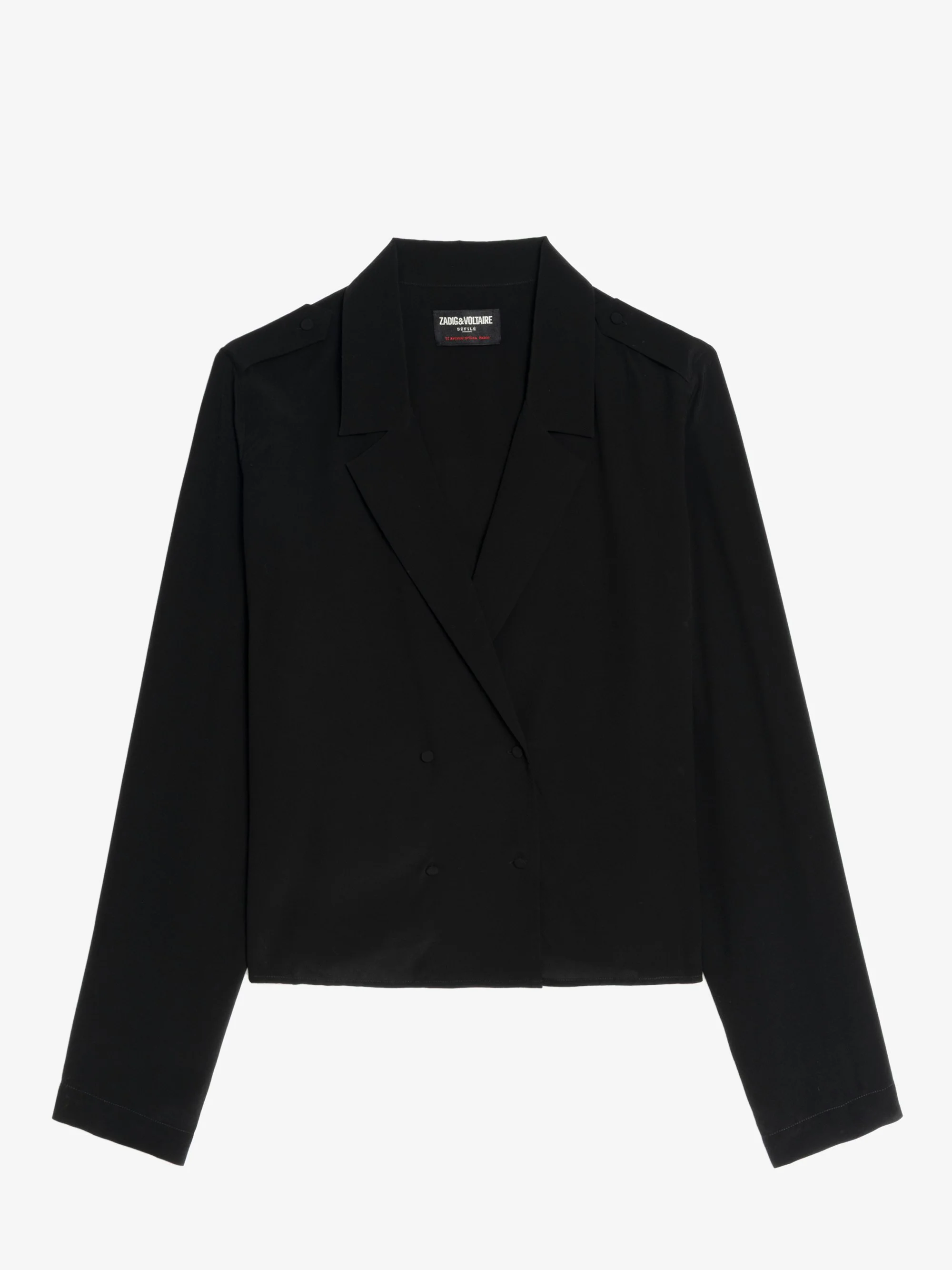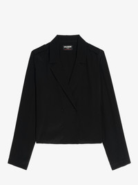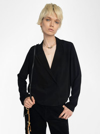 This black double-breasted shirt redefines tailoring with a rebellious twist—fluid lines, undone edges, and just the right amount of allure. Worn buttoned up or layered loose, it's a quiet force in your wardrobe. Rock chic, always. Description & details - Women's black tailored shirt - Double breasted - Coated buttons - Long sleeves - Epaulette on shoulders This item fits true to size. Choose your usual size. Composition 100% Viscose** Product code: WWSH02232_BLACK