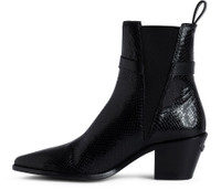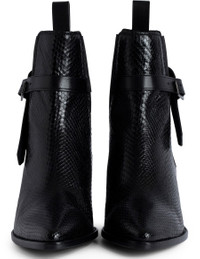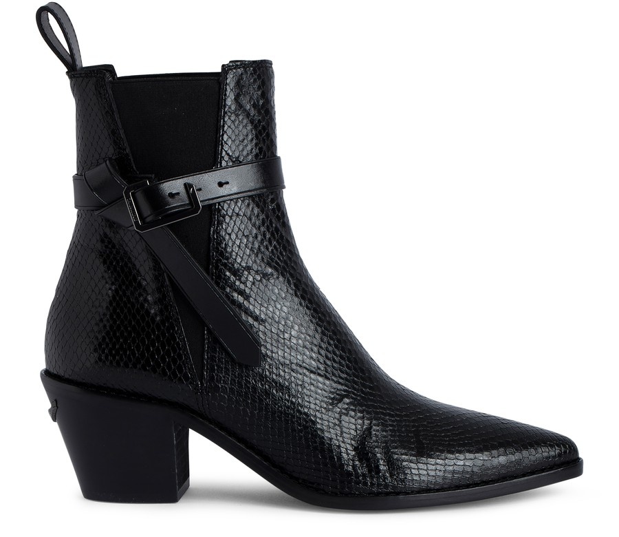 DESCRIPTION - block heel - pointed toe - logo at the back - engraved logo - metallic logo on the side - medium heel - metal finish - elasticated sides - buckled ankle strap - high-top upper DETAILS AND CARE MATERIAL: 100% Cowhide HEEL HEIGHT: 6 cm / 2.4 " COLOR: schwarz COUNTRY OF MANUFACTURE: Spain PRODUCT CODE: ZADX79U4BCKT6AAA00