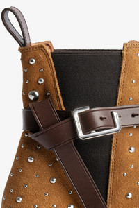 Women's brown suede boots with all-over studs Description & details The timeless Tyler leather boots have been revamped this season in a suede version, featuring all-over studs and a C-shaped metal buckle. - Zadig&Voltaire women’s ankle boots in Folk brown suede - Silver-tone round studs - Adjustable leather strap with a C-shaped metal buckle - Back tab - Elastic on sides - Angled heels with a metal wings charm - Heel height: 6cm - Made in Spain - Product code: SWCT00765 Heel : 6 cm Composition 100% Cow leather Care Do not expose your item to a source of heat or to sunlight for a prolonged period. In the event of exposure to water, leave your item to dry at room temperature, away from direct light. Brush your shoes after every wear and let them rest as much as possible between each wear, with shoetrees inside them to let them breathe and to maintain their shape. For protection from rain and stains, your suede item needs waterproofing before you first use it. Product code: SWCT00765_FOLK