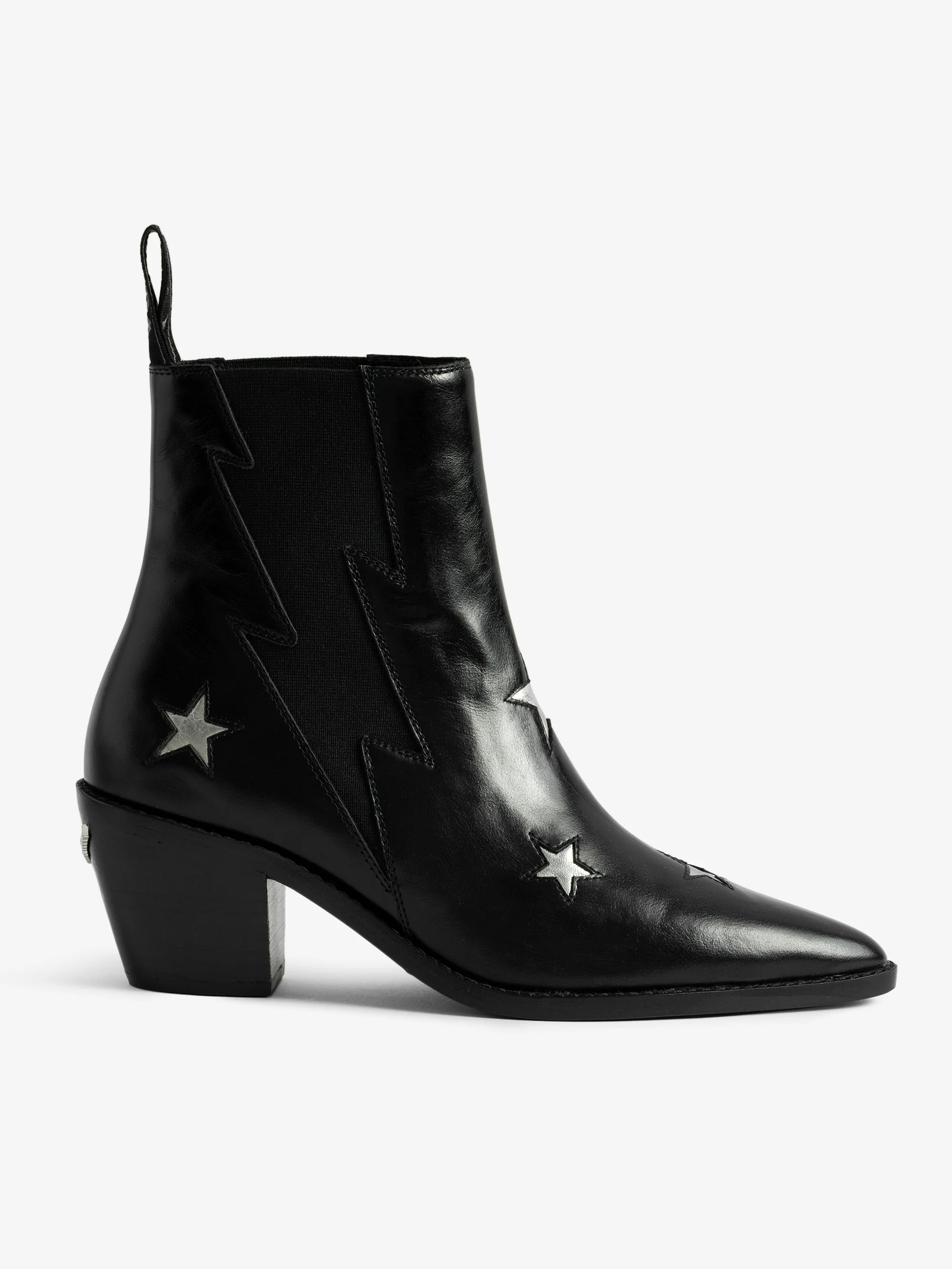 Ankle boots in vintage-effect leather adorned with stars and a lightning-shaped elastic. Description & details - Ankle boots in vintage-effect leather - Stars - Lightning-shaped elastic closure - Signature wings at the back - Heel height: 6 cm This item fits true to size. We recommend choosing your usual size. Composition 100% Cow leather Care - Protect your leather item from humidity and any source of heat (radiator, sun) - Avoid your item coming into contact with water - Regularly care for your leather item using a colourless nourishing cream for leather, suitable for leather goods - Ensure you wear your item with similar colours - Avoid overfilling your bag to ensure its durability - In case of stains, contact a leather professional Product code: SWCT02054_BLACK