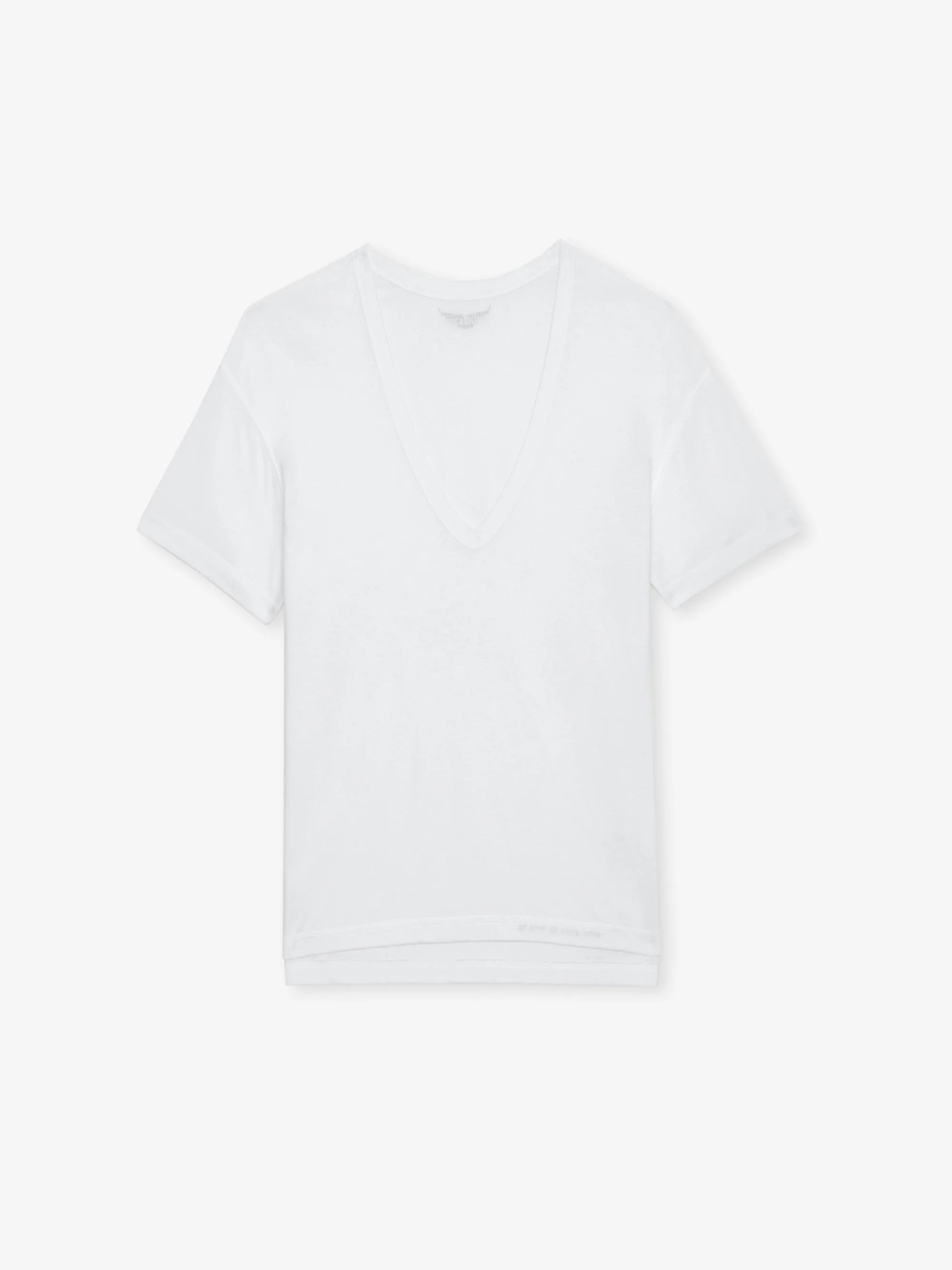 White short-sleeve T-shirt with signature crystal wings on the back. Description & details - Women's white T-shirt - Signature ZV wings adorned with rhinestones on the back - Round neckline - Short sleeves Model is 176 cm / 5' 9" and is wearing a size S This item is true to size. We recommend buying your usual size. Composition 50% Polyester* 30% Cotton 20% Linen Care - Machine-wash inside out on a 30°C delicate cycle with similar colours - Air dry - Iron inside out at a maximum of 110°C, avoiding any customised details Product code: JWTS02726_WHITE