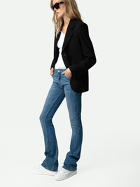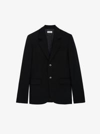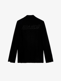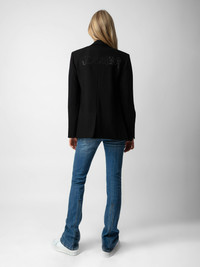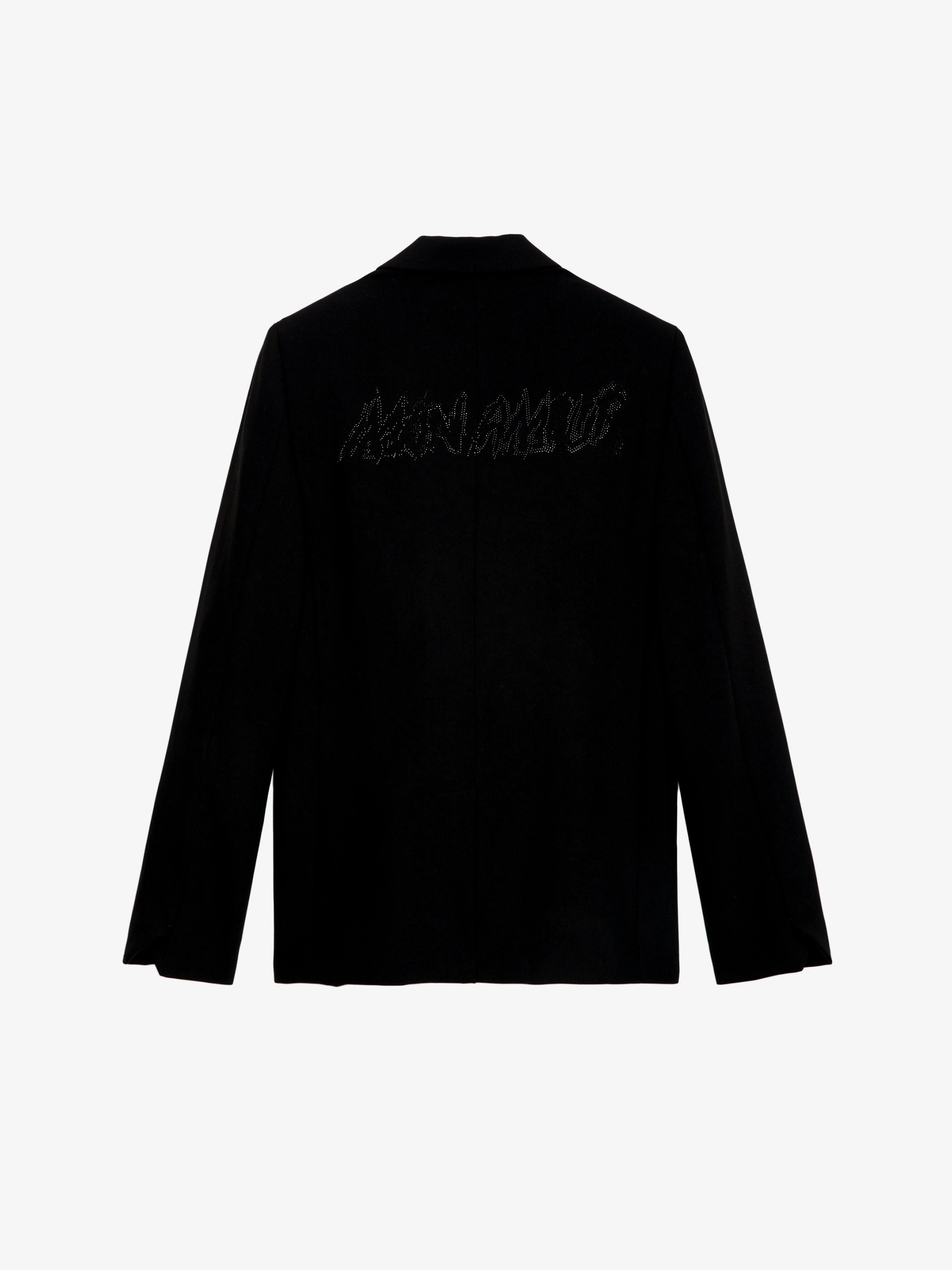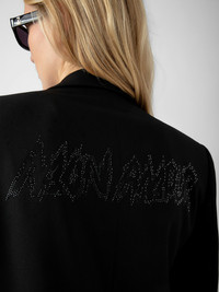 Women's black blazer with diamanté manifesto. Description & details - Women's black structured blazer - Masculine cut - Diamanté-embellished "Mon Amour" manifesto on back - Tailored collar and double-breasted fastening - Piped chest pocket and 2 flap pockets - Long sleeves and slit at back Model is 174 cm / 5' 8" and is wearing a size S This item is true to size. We recommend buying your usual size. Composition 64% POLYESTER 34% VISCOSE 2% ELASTANE Product code: WWBL00840_NOIR