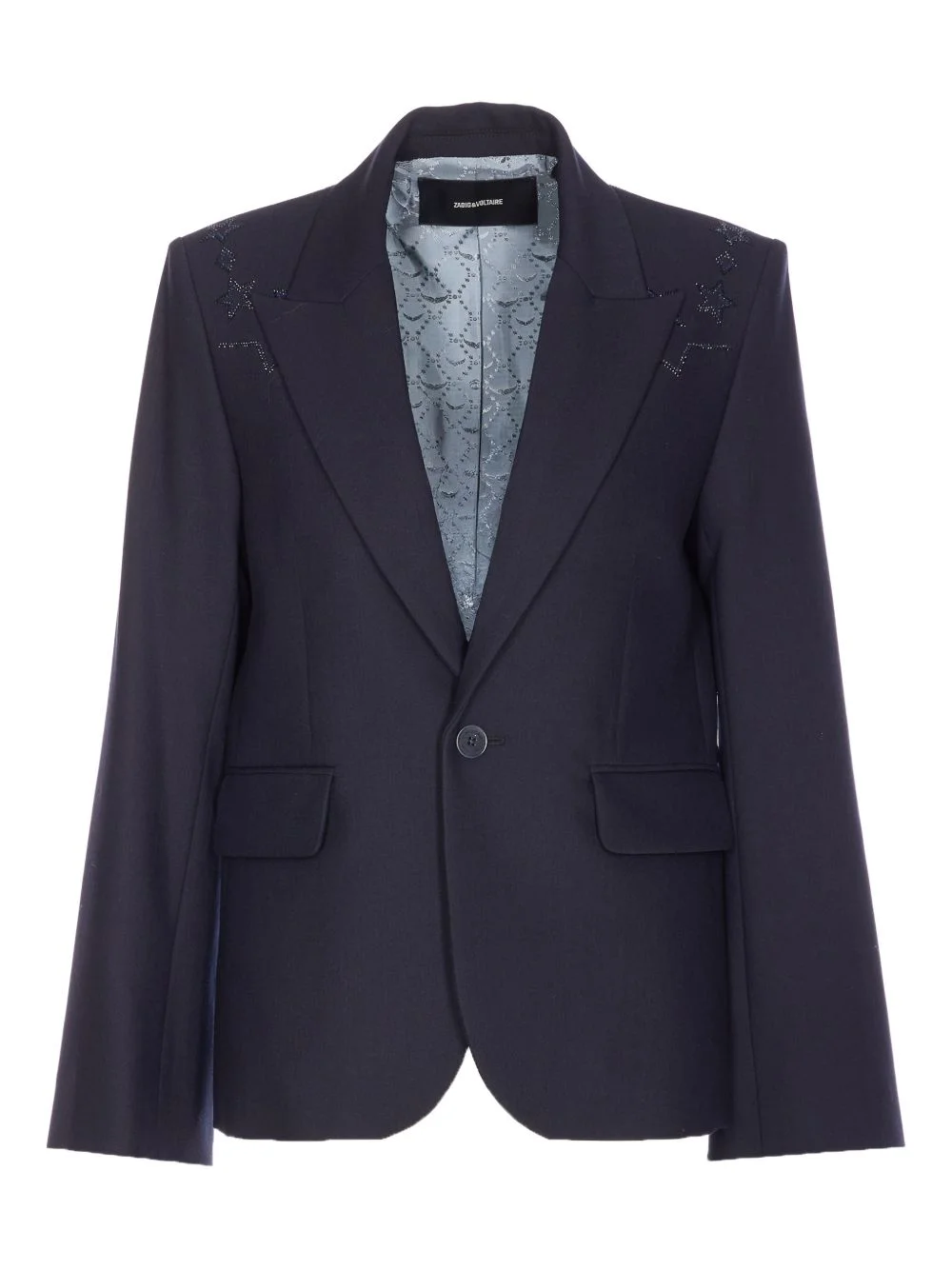 Vavy rhinestone-embellished blazer Highlights - Navy blue - Rhinestone embellishment - Button fastening - Long sleeves Imported Composition Recycled Polyester 43%, Polyester 26%, Viscose 23%, Elastane 8% Washing instructions Dry Clean Only