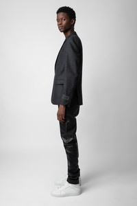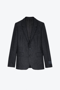 Unisex striped anthracite grey flannel wool blazer. Description & details - Unisex striped anthracite grey flannel wool blazer - Tailored collar and shoulder pads - Piped chest pocket and 2 flap pockets - ZV button fastening - Long sleeves and mitred cuffs - Made in Portugal Model is 188 cm / 6' 2" and is wearing a size M This item is true to size. We recommend buying your usual size. Composition 68% WOOL 25% POLYAMID 5% POLYESTER 2% COTTON Care Suits should be dry-cleaned only. Nonetheless, it is possible to smooth out creases by steaming from a distance of 8 in. Product code: WMBL00157_ANTHRACITE