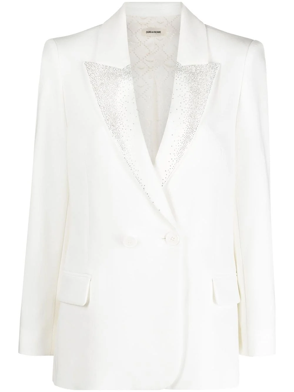 Visit rhinestone-embellished blazer Imagined in delicate white, this blazer displays the sophisticated side of Zadig & Voltaire. The tailored piece has an elegant double-breasted silhouette which is elevated by its rhinestone-embellished peak lapels. Imported Composition Outer: Polyester 69%, Viscose 23%, Spandex/Elastane 8% Lining: Viscose 100% SIZE & FIT Model measurements Height 5 ft 10 in(1.79 m) Bust/Chest 31.1 in(79 cm) Hips 35.03 in(89 cm) Waist 24.01 in(61 cm) FittingInformation This piece fits true to size. We recommend you get your regular size Cut for a loose fit Made with a mid-weight fabric Washing instructions Dry Clean Only