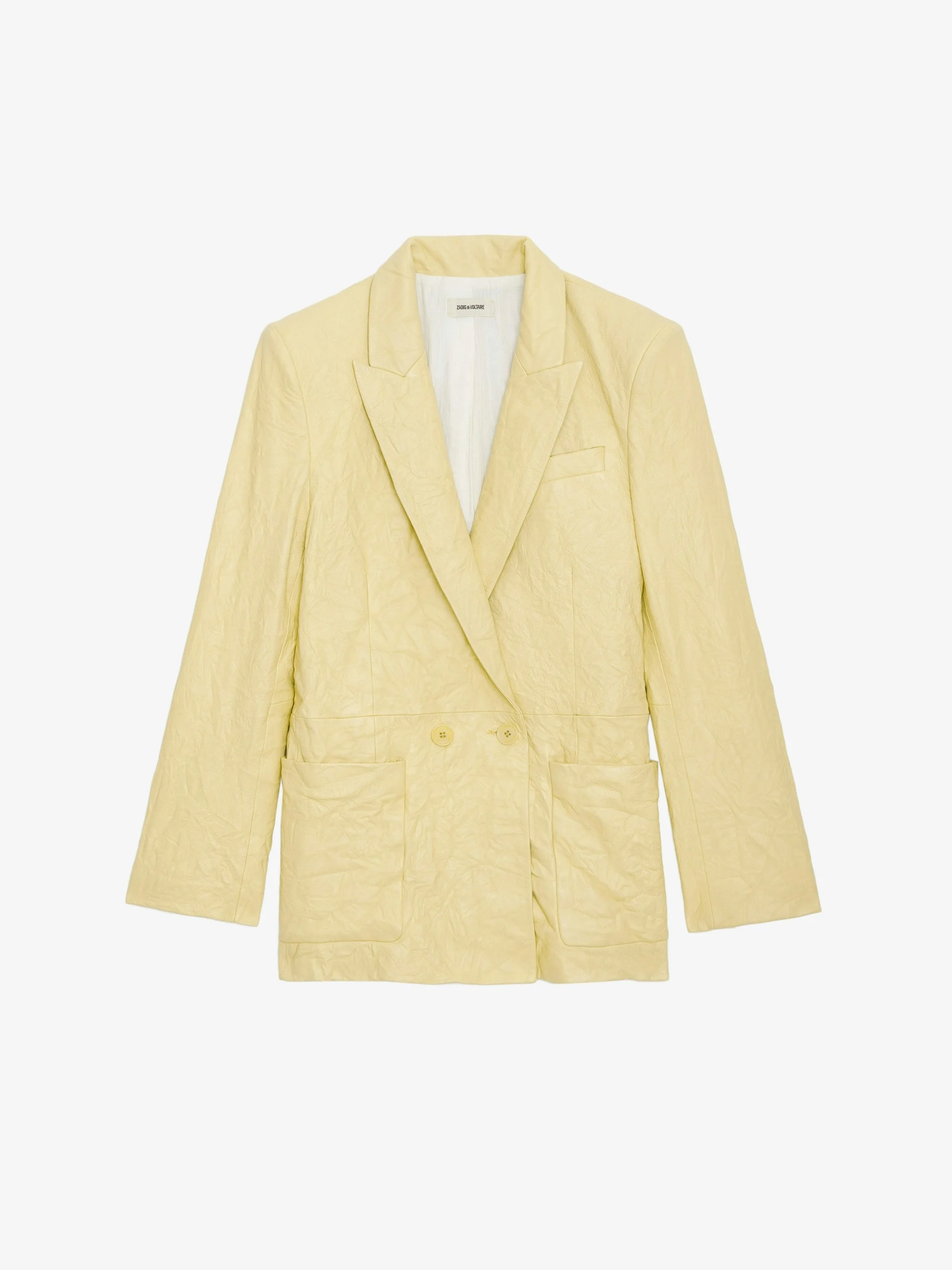 Women’s light yellow crinkled leather blazer with button fastening and pockets. Description & details Zadig&Voltaire’s signature material, crinkled leather is obtained by means of a multi-step process developed by the brand, guaranteeing a unique product that showcases exceptional know-how. - Women’s Shea light yellow crinkled leather blazer - Tailored collar and shoulder pads - Double-breasted fastening - 2 pockets and 1 piped pocket - Long sleeves and mitred cuffs Model is 174 cm / 5' 8" and is wearing a size S This item is true to size. We recommend buying your usual size. Composition 100% LAMBSKIN Care Do not expose your item to a source of heat or to sunlight for a prolonged period. In the event of accidental exposure to water, leave your item to dry at room temperature, away from direct light. To maintain the shine of your smooth or crumpled leather item, use a leather cream or polish. If your item needs cleaning, we recommend contacting a leather specialist. Product code: RWBL00003_SHEA