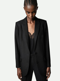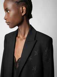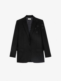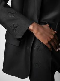 Women’s black blazer with star rhinestones. Description & details This essential black blazer structures the silhouette and adds just the right amount of elegance. A Zadig&Voltaire staple, this version is decorated with rhinestones star embellishments. - Zadig&Voltaire women’s black blazer - 1 button closure - Rhinestone stars on shoulder and sleeve - 2 flap pockets - Long sleeves - Slit in the back Model is 176 cm/5'7" and is wearing a size 36 Model is 176 cm / 5' 9" and is wearing a size 36 This item is true to size. We recommend buying your usual size. Composition 69% POLYESTER 23% VISCOSE 8% ELASTHANNE Care This garment should be dry-cleaned only. Product code: WKCA0202F_NOIR