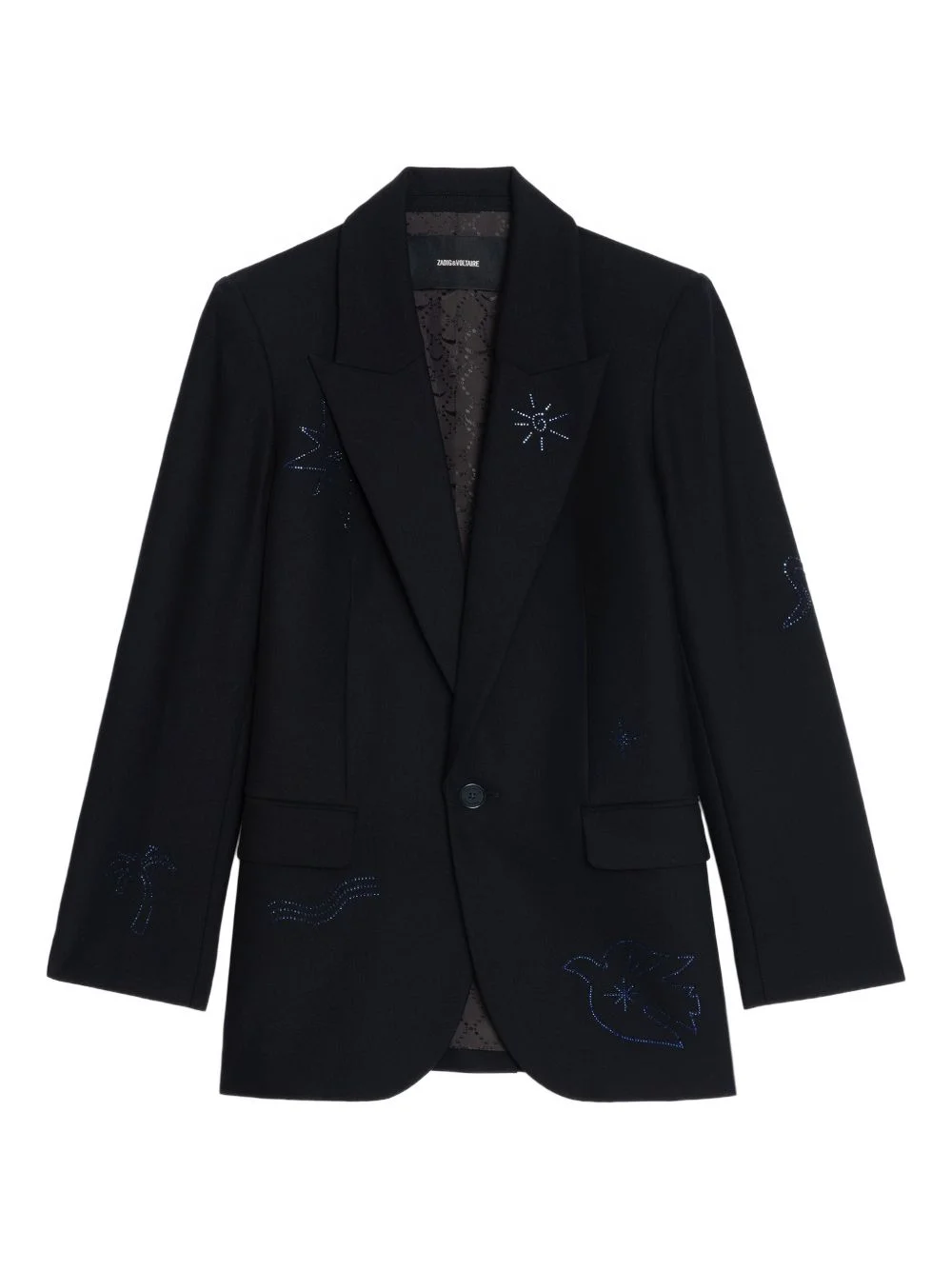 Vival blazer Highlights - Navy blue - Rhinestone embellishment - Graphic motif - Notched lapel - Single-button closure - Flap pockets Imported Composition Recycled Polyester 43%, Polyester 26%, Viscose 23%, Elastane 8% Washing instructions Specialist Cleaning