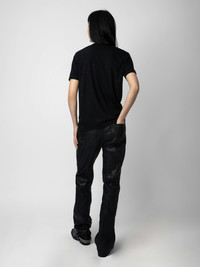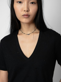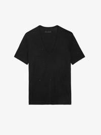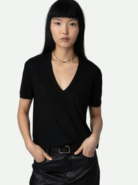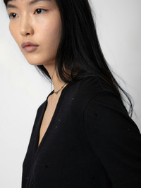 Black short-sleeved T-shirt with V neckline and diamanté. Description & details - Women’s black T-shirt - Silver diamanté - V neckline - Short sleeves Model is 177 cm / 5' 9" and is wearing a size S This item is true to size. We recommend buying your usual size. Composition 50% POLYESTER* 30% COTTON 20% LINEN Care - Machine-wash inside out on a 30°C delicate cycle with similar colours - Air dry - Iron inside out at a maximum of 110°C, avoiding any customised details Product code: JWTS01646_NOIR