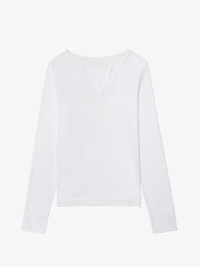 White long sleeved t-shirt with fishnet cutout on back. Description & details - White organic cotton henley t-shirt for women - Fishnet embroidery at the back - V-shaped henley t-shirt collar with 5 buttons - Long sleeves with raw edges This item fits true to size. Choose your usual size. Composition 100% Cotton* Product code: JWTN02640_WHITE
