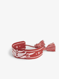 Red woven bracelet adorned with embroidered wings and cords. Description & details - Women's red woven Power bracelet - Contrasting wings embroidery - Drawstring cords with tassels 14 x 2 cm Composition 100% Polyester Care - Clean you jewellery with a soft, dry cloth - Avoid contact with water and chemicals (fragrance, cosmetics, chlorine, hydroalcoholic gel) - Protect your jewellery from humidity and any source of heat - Avoid sleeping with your jewellery on - Store your jewellery in its protective pouch " Product code: OWJW01721_POWER