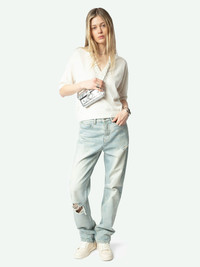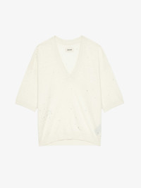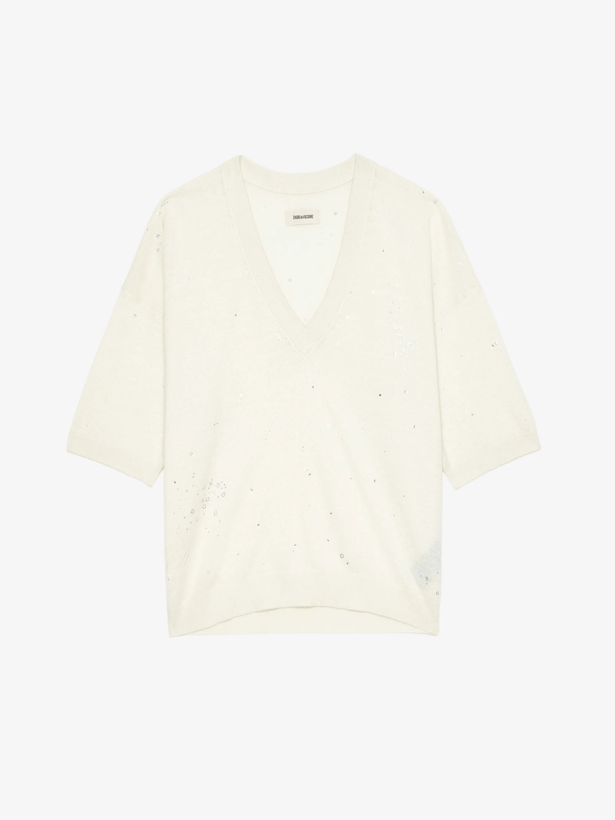 Cozy meets cool with a touch of sparkle. This ultra-soft white rhinestone sweater wraps you in effortless warmth without losing its edge. Shimmering crystal accents trace the neckline and scatter across the front, delivering refined, rock-chic glamour. A clean V neck and short sleeves let the white rhinestone sweater layer under leather or stand alone over denim, carrying laid-back polish from crisp mornings to late-night sets. Description & details - Ultra-soft cotton-blend white rhinestone sweater with a subtly brushed feel - Hand-set rhinestones along the V neckline and body add understated shine - Short sleeves with ribbed cuffs and a ZV pointelle signature at the hem - Relaxed, hip-grazing silhouette styles, loose or lightly tucked for versatility - Straight ribbed hem keeps the fit neat while allowing easy layering Model is 177 cm / 5' 9" and is wearing a size S This item is true to size. We recommend buying your usual size. Composition 50% Linen 36% Cotton** 14% Polyamide Care - Hand-wash or machine-wash on a 20°C wool cycle with a maximum spin speed of 400 rpm - Do not wring - Air dry flat - Iron inside out at a maximum of 110°C, avoiding any customised details Product code: KWSW02775_ECRU