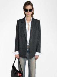 Structured straight blazer in flannel with shimmer stripes, elbow patches and crossed button closure. Description & details - Structured straight blazer in flannel - Stripes - Classic collar - Crossed button closure - Piped pockets, flap pockets and welt pockets - Long sleeves - Shoulder pads and elbow patches Model is 180 cm / 5' 10" and is wearing a size s This item has a loose fit. For a more fitted look, choose one size down from your usual size. Composition 48% Viscose** 34% Wool** 14% Polyamide** 2% Other fibres 1% Elasthanne 1% Polyester Care This garment should be dry-cleaned only. Product code: WWBL01942_ANTHRACITE