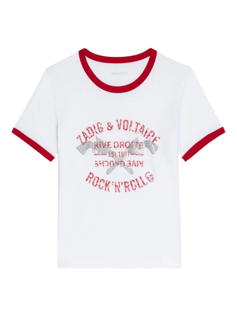 rhinestone-embellished T-shirt Highlights - White - Red trim - Rhinestone embellishment - Graphic print - Short sleeves - Crew neck Imported Composition Cotton 100% Washing instructions Machine Wash