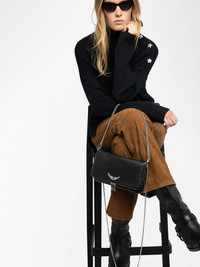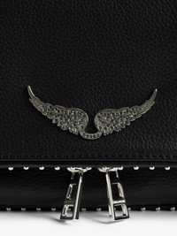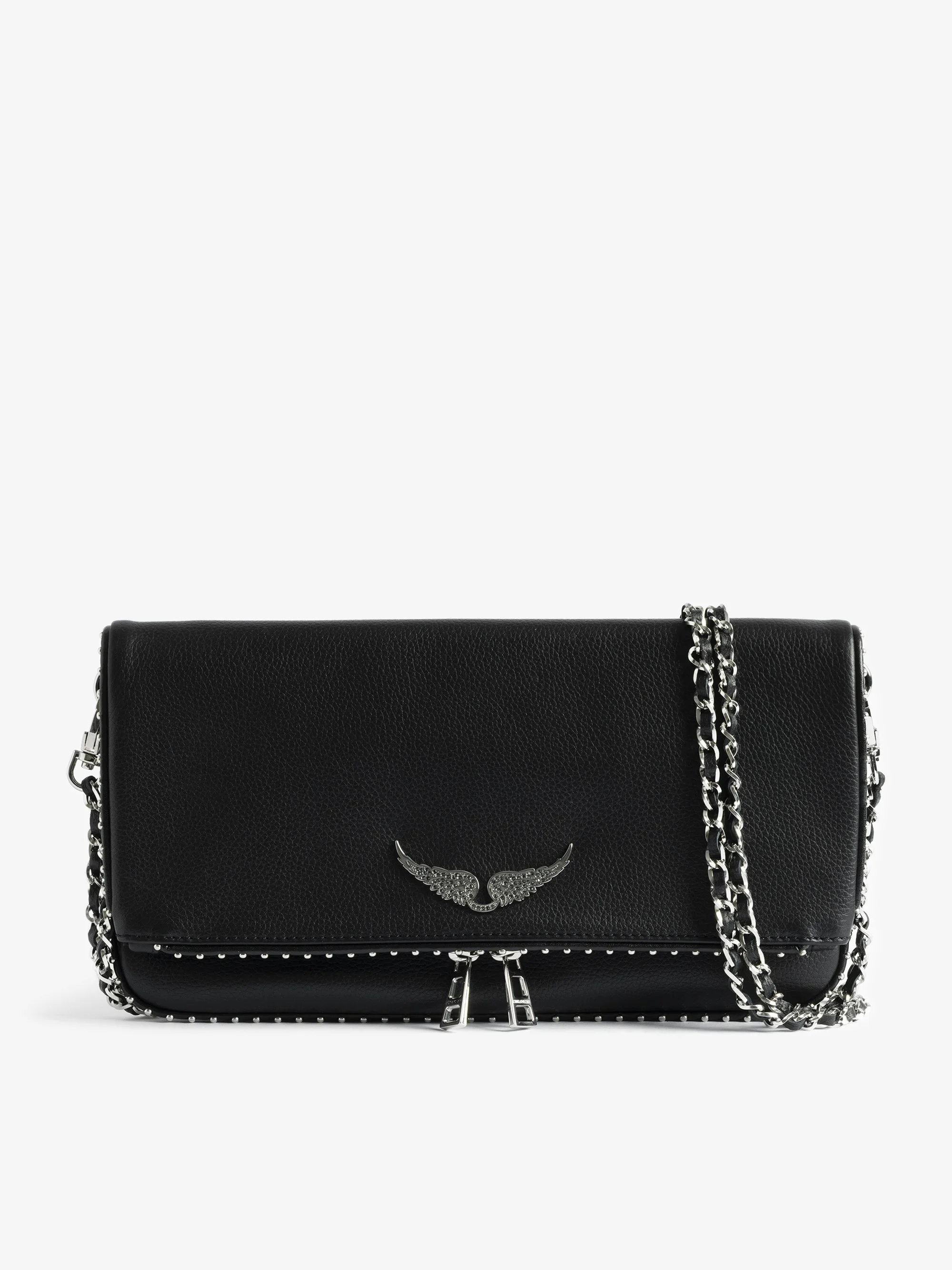Rock iconic studded black grained leather clutch. Description & details - Rock iconic women’s studded black grained leather clutch - Two removable metal chains - Zip and magnet closure - Small back zip pocket and inside patch pocket - Diamante-embellished wings - Carry by hand, over the shoulder or across the body 13 x 2 cm Composition 100% Cow leather Care - Protect your leather item from humidity and any source of heat (radiator, sun) - Avoid your item coming into contact with water - Regularly care for your leather item using a colourless nourishing cream for leather, suitable for leather goods - Ensure you wear your item with similar colours - Avoid overfilling your bag to ensure its durability - In case of stains, contact a leather professional Product code: LWBA00002_BLACK