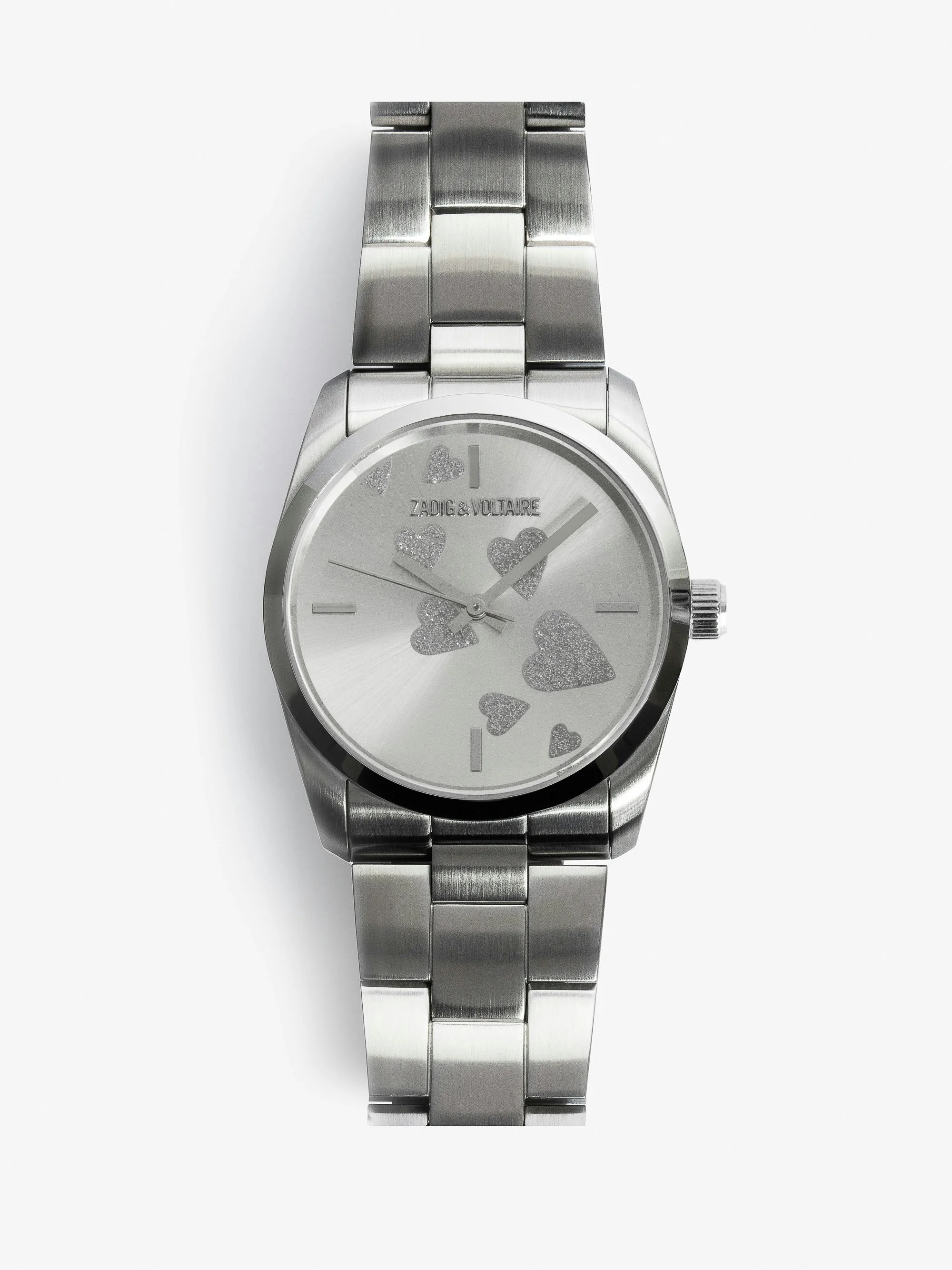 Silver toned stainless steel watch with silver diamante hearts on dial. Description & details - Unisex gray stainless steel watch - Silver dial with heart motifs - Diameter 36 mm - Quartz movement - Functions: hour/minute - Water-resistant to 5 bar - Steel bracelet - Round case Composition 100% Steel Product code: OWWT00128_SILVER