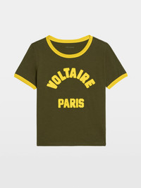 Round neck short-sleeved t-shirt with writing on the front. Description & details - T-shirt in 100% cotton - "Voltaire Paris" print on the front - Round neck - Short sleeves Model is 178 cm / 5' 10" and is wearing a size S This item fits true to size. Choose your usual size. Composition 100% Cotton* Care - Machine-wash inside out on a 30°C delicate cycle with similar colours - Air dry - Iron inside out at a maximum of 110°C, avoiding any customised details Product code: JWTS02851_TILLEUL