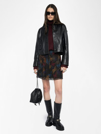 Short chiffon skirt with print and slit, zip fastening. Description & details - Short chiffon skirt - Horse print - Back zip fastening - Slit Model is 179 cm / 5' 10" and is wearing a size S This item fits true to size. Choose your usual size. Composition 100% Viscose** Care - Hand-wash or machine-wash inside out in a mesh laundry bag on a 20°C delicate cycle with a maximum spin speed of 400 rpm - Air dry flat - Iron inside out at a maximum of 110°C Product code: WWSK01623_DARK CHOCOLATE
