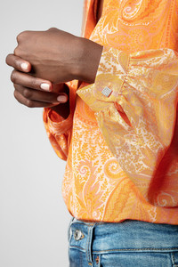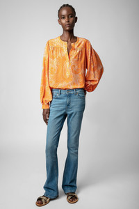 Women's orange paisley-print silk blouse Description & details Romantic and bohemian, the Tigy cotton blouse features this season's key print: paisley. The blouse has a round buttoned neckline and gathered details, and features jewelled buttons on the cuffs. - Women's Zadig&Voltaire Corail orange silk blouse - Paisley print - Long sleeves - Gathered - Round neck - Placket - Jewelled buttons on cuffs - Model is 5' 10" and is wearing a size S - Made in China - Product code: WWSH00508_CORAIL Model is 178 cm / 5' 10" and is wearing a size S This item is true to size. We recommend buying your usual size. Composition 100% Silk Care Hand-wash or machine-wash your garment at a maximum of 20 °C, in a mesh laundry bag and inside out, with a gentle spin cycle. Air-dry. Iron your garment on a low heat setting or steam from a distance of 20 cm, being particularly careful with customised details. Product code: WWSH00508_CORAIL