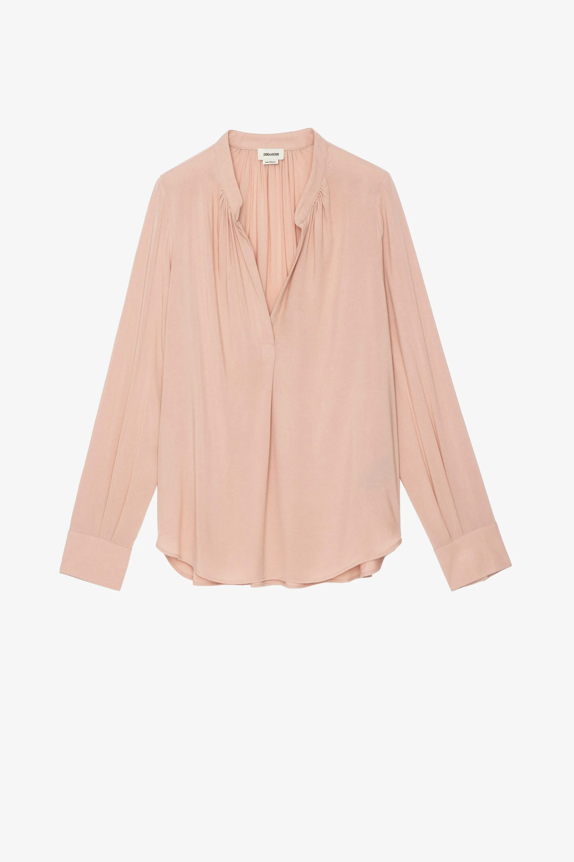 Women’s light pink blouse with open collar. Description & details - Women’s flowing light pink blouse - Open collar - Gathered details and pleats at the back - Long sleeves and buttoned cuffs Composition 100% Viscose Care Hand-wash or machine-wash your garment at a maximum of 20 °C, in a mesh laundry bag and inside out, with a gentle spin cycle. Air-dry. Iron your garment on a low heat setting or steam from a distance of 20 cm, being particularly careful with customised details. Product code: WWSH00177_POUDRE