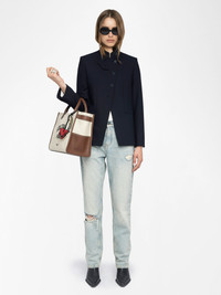 Structured regular fit blazer, high collar and rhinestone wing applique, button fastening. Description & details - Blazer - Stand-up collar with two decorative buttons - Asymmetric front button fastening - 2 welt pockets - Long sleeves with shoulder pads - Wing-shaped rhinestone detail on the collar Model is 180 cm / 5' 10" and is wearing a size 36 This item fits true to size. Choose your usual size. Composition 43% Polyester** 26% Polyester 23% Viscose 8% Elasthanne Care This garment should be dry-cleaned only. Product code: WWBL01944_ENCRE
