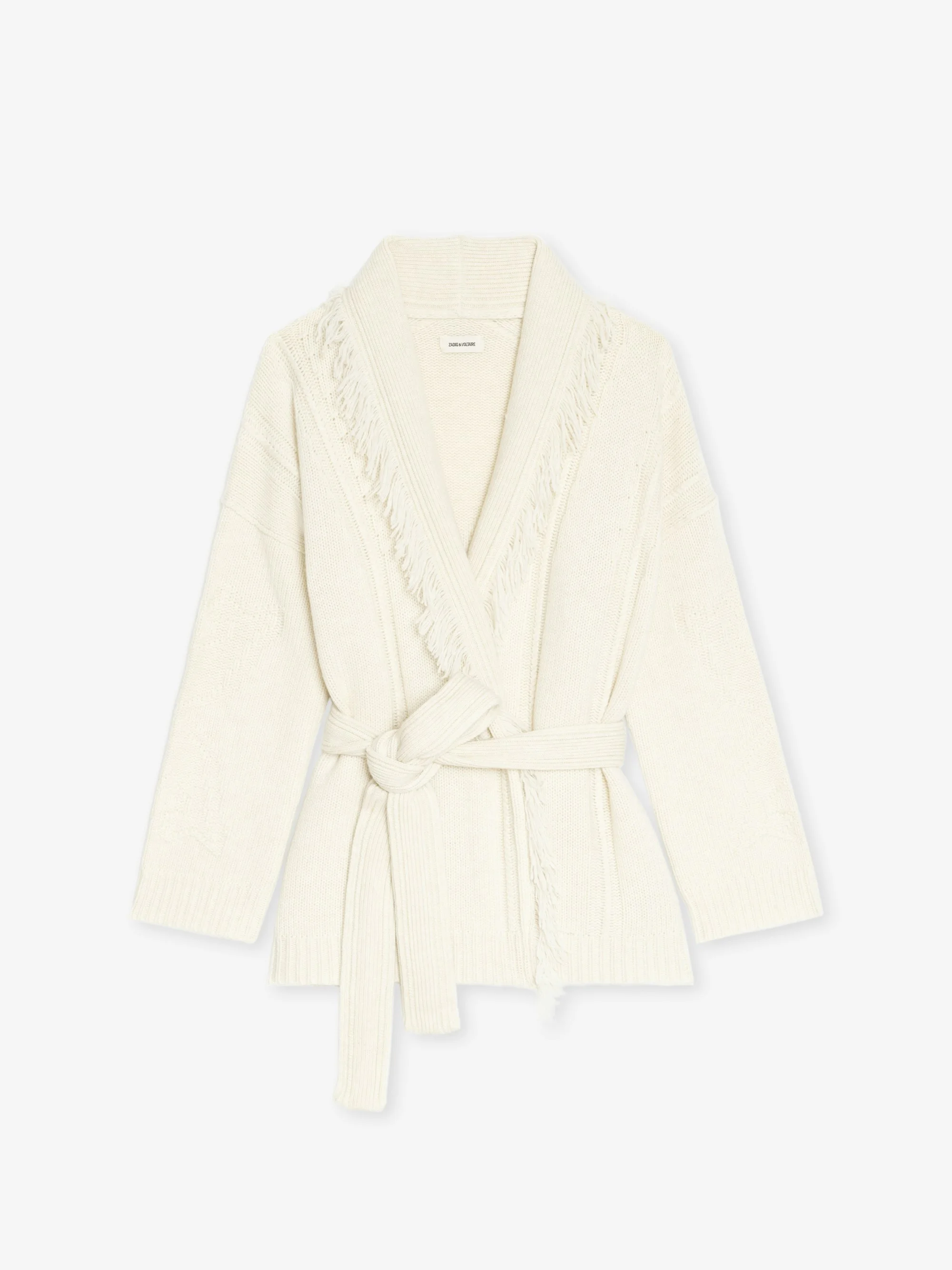 Cardigan coat with fringe and wings at the back, tie closure. Description & details - Mid-length cardigan coat in wool and cashmere - Fringe - V-neck - Cross-over closure with removable belt - Wings signature at the back - Long sleeves Model is 180 cm / 5' 10" and is wearing a size s This item fits true to size. Choose your usual size. Composition 90% Wool* 10% Cashmere Care This garment should be dry-cleaned only. Product code: KWCO01526_ECRU