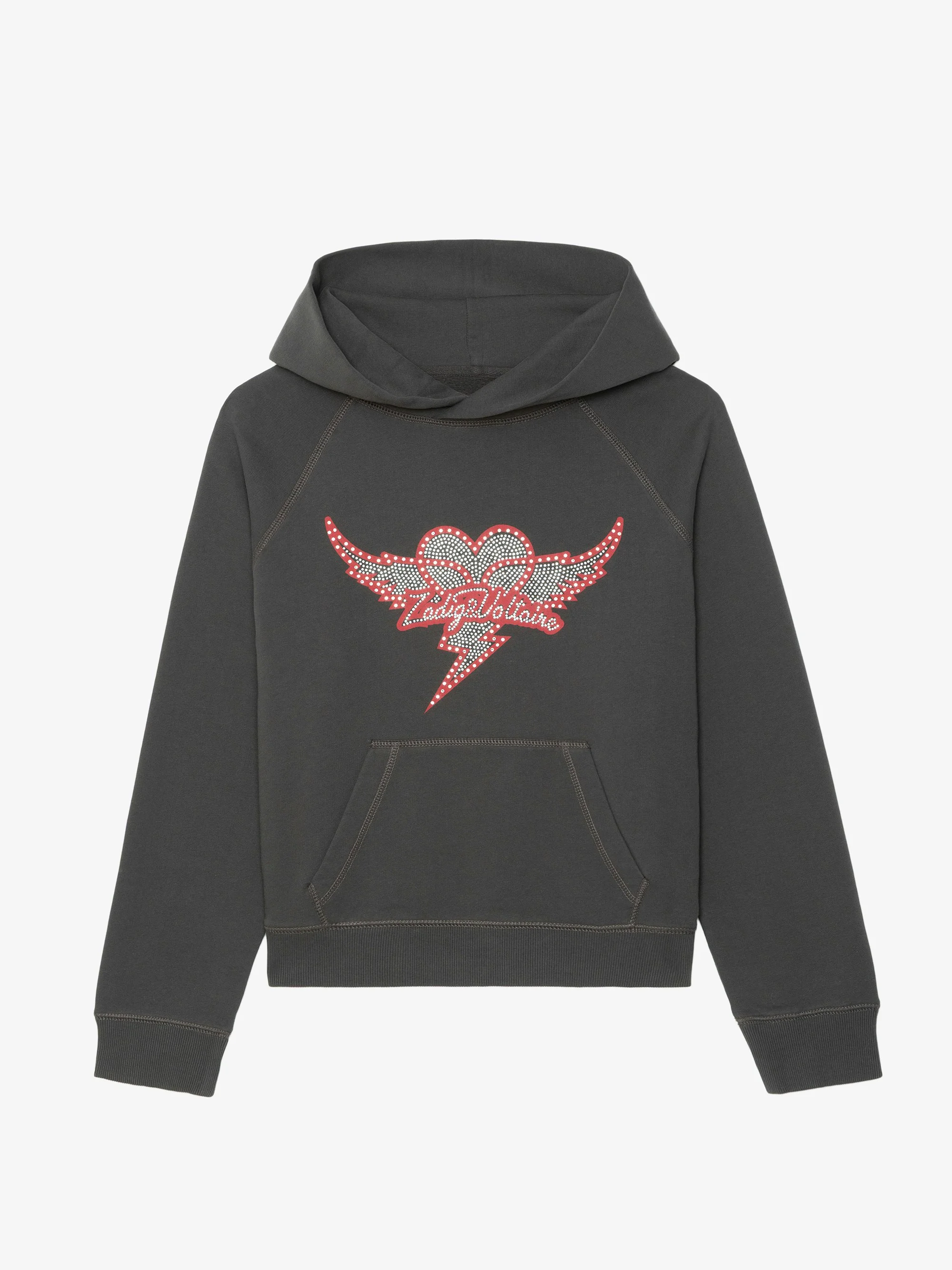 Hooded sweatshirt with print and rhinestones. Description & details - Cotton sweatshirt - "Heart wings" print with rhinestones - Hood - Patch pockets - Long sleeves Model is 181 cm / 5' 11" and is wearing a size S This item has a loose fit. For a more fitted look, choose one size down from your usual size. Composition 100% Cotton** Care - Machine-wash inside out on a 30°C delicate cycle with similar colours - Air dry - Iron inside out at a maximum of 110°C, avoiding any customised details Product code: JWSS01688_CARBONE