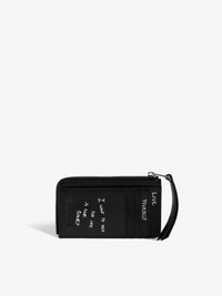 Card holder in leather with wings signature and graffiti print. Description & details - Card holder in leather - Graffiti print - 4 card slots - One flat pocket and one zipped pocket - Zip closure - Wings signature in rhinestones 13.5 x 8 cm Composition 100% Cow leather Care - Protect your leather item from humidity and any source of heat (radiator, sun) - Avoid your item coming into contact with water - Regularly care for your leather item using a colourless nourishing cream for leather, suitable for leather goods - In case of stains, contact a leather professional Product code: LWSG03731_BLACK