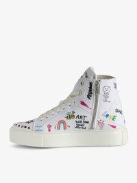 White canvas high-top trainers with chunky sole and customized details designed by Humberto Cruz. Description & details Customized details designed by Humberto Cruz, an artist and illustrator from San Diego. Influenced by pop culture, fashion and colors, he describes his work as spontaneous and quirky. - Women’s white canvas high-top trainers with laces and zip - Lightning overstitching - Chunky wedge insole: 2.7 cm - Made in Portugal Composition 55% COTTON 45% COTTON** Care - Protect your leather item from humidity and any source of heat (radiator, sun) - Avoid your item coming into contact with water - Regularly maintain the shine of your smooth or grained leather shoes with a leather polish Product code: SWSN00499_BLANC