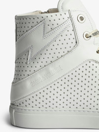 Women's high-top sneakers in smooth white leather with perforated stars Description & details Featuring flash overlays and perforated stars, the Zadig&Voltaire signature ZV1747 high-top sneaker has been revamped in this new version with silver-tone ZV-printed laces and a zip fastening on the inside. - Women's Zadig&Voltaire ZV1747 high-top sneakers in smooth white leather - Perforated stars - Flash overlays - ZV-printed laces - Inner zip fastening - ZV-printed tongue - Platform insole: 2.7 cm - Made in Portugal - Product code: SWSN00403_BLANC Platform insole: 2.7 cm. This item is true to size. We recommend buying your usual size. Composition 100% CALFSKIN Care Do not expose your item to a source of heat or to sunlight for a prolonged period. In the event of accidental exposure to water, leave your item to dry at room temperature, away from direct light. Brush your shoes after every wear and let them rest as much as possible between each wear, with shoetrees inside them to let them breathe and to maintain their shape. To maintain the shine of your smooth or grained leather item, use a leather cream or polish. Product code: SWSN00403_BLANC