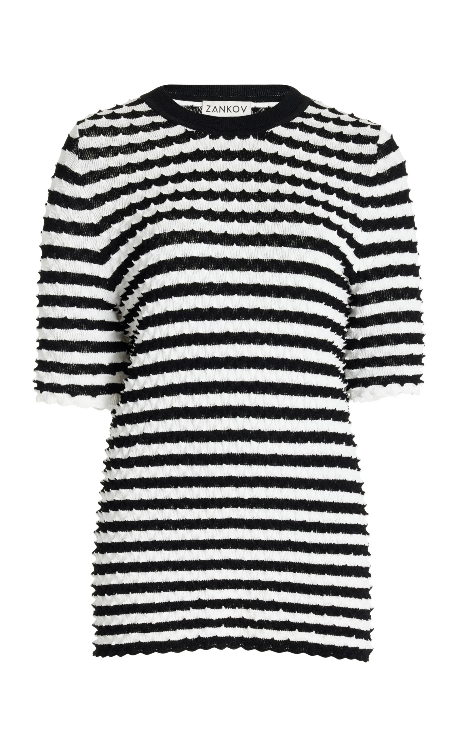 ZANKOV is a knitwear collection that establishes a new visual language in fashion and textiles through shape, texture and color. Quality and finish are paramount: the inside of each garment is just as important as the outside. Zankov often juxtaposes fine natural fibers such as virgin wools, mohair, Merino and Alpaca with distinctly crafted techniques such as intarsias, double knit jacquards and digital printing. Crafted from a viscose-elite blend, the 'Elodie' tee uses a knitting technique with accentuated point details throughout. PRODUCT DETAILS - Spring/Summer '25 - Slip on - Composition: 83% Viscose, 17% Elite - Dry clean only - Imported SIZE & FIT - Designed for a slim fit