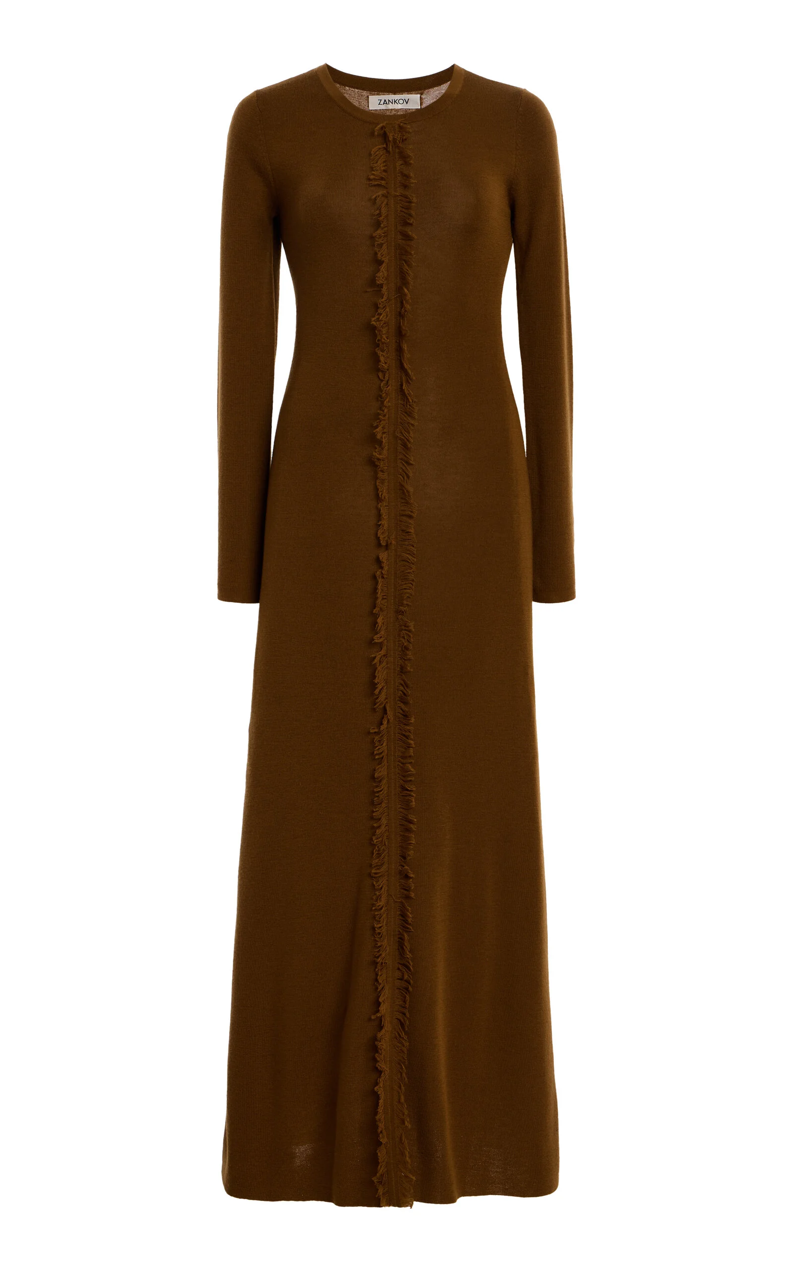 ZANKOV is a knitwear collection that establishes a new visual language in fashion and textiles through shape, texture and color. Quality and finish are paramount: the inside of each garment is just as important as the outside. Zankov often juxtaposes fine natural fibers such as virgin wools, mohair, Merino and Alpaca with distinctly crafted techniques such as intarsias, double knit jacquards and digital printing. Made just for us, 'Rowen' is a T-shirt dress cut from ribbed merino wool jersey with eyelash fringe tracing the front and sleeves. PRODUCT DETAILS - Resort '26 - Slip on - Composition: 100% merino wool - Designer color: Cognac - Dry clean - Imported