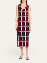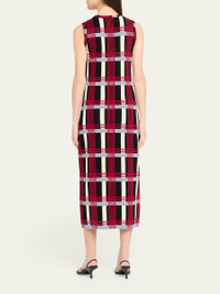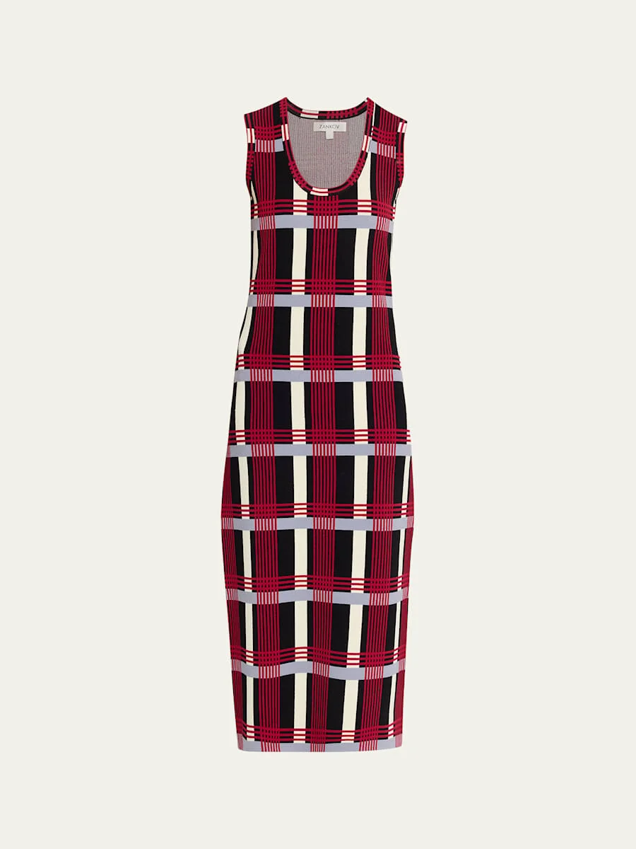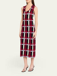 ZANKOV "Juliette" dress fetauring anabstract check intarsia Scoop neckline Sleeveless Sheath silhouette Hem falls below the knee Slipover style Viscose/Elite® polyester Dry clean, professional cleaning recommended Imported