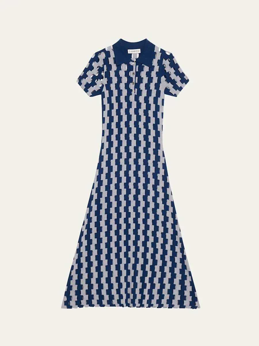 ZANKOV "Margerite" open-knit skirt in colorblock abstract design Spread collar; button placket Short sleeves Midi length Sheath silhouette Slipover style Merino wool Dry clean, professional cleaning recommended Imported Online Inquiries: BGS21_B9NT0| Store Inquiries: #4927947
