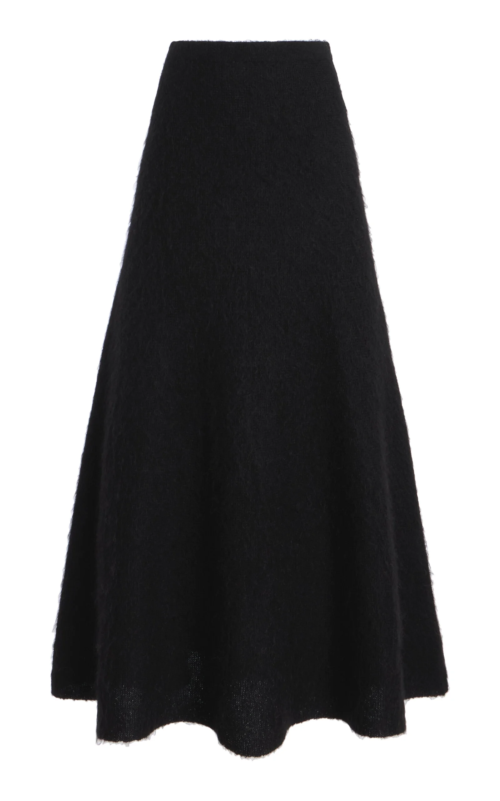 PRODUCT DETAILS - Low-waisted, flared hem, midi - Slip on - Unlined - Composition: 35% Mohair, 35% Alpaca, 30% Polyamide - Color: black - Dry clean only - Fall/Winter '25
