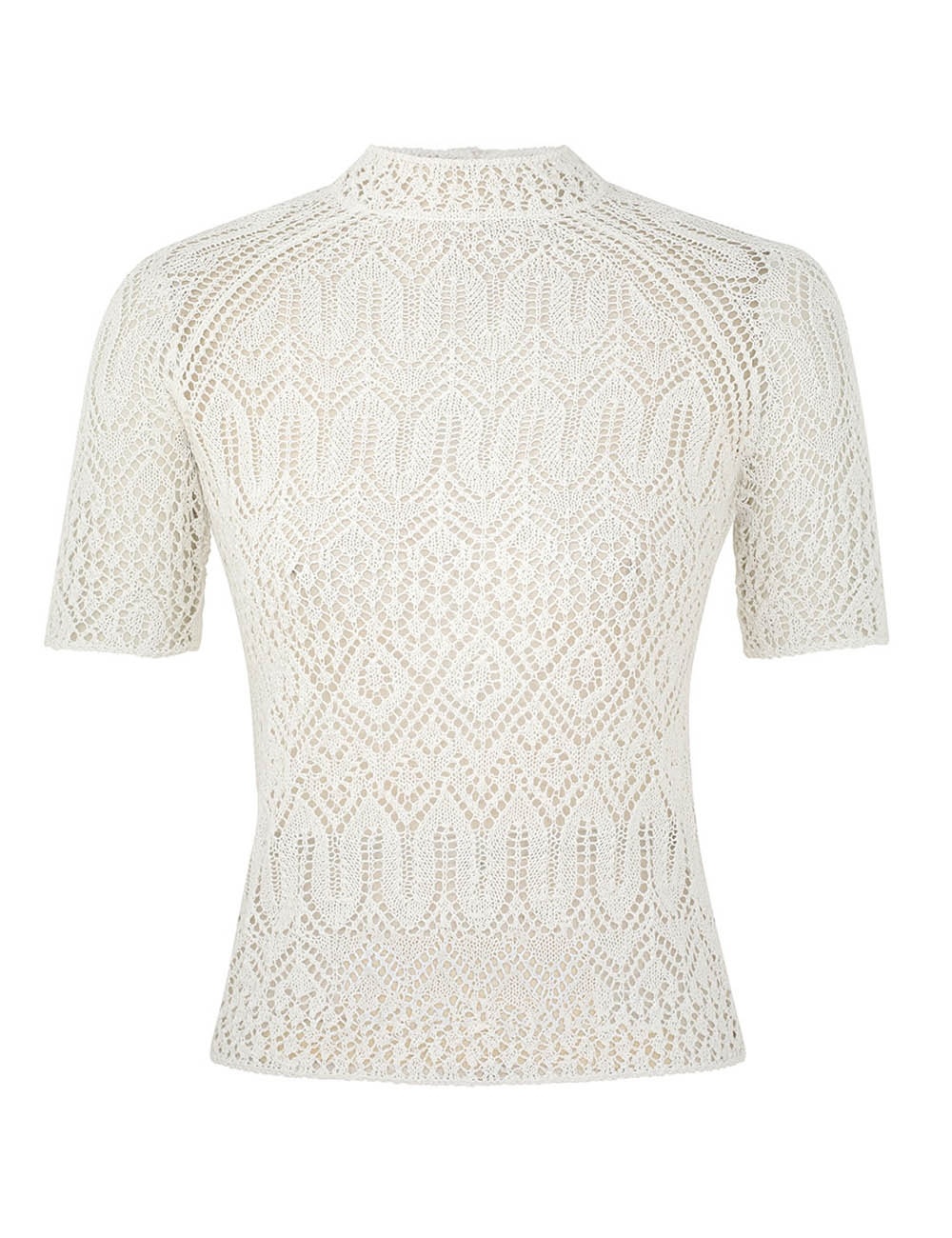 ITEM DETAILS The Acacia Lace Knit Tee in Ivory from our Resort Swim 2025 Collection. A lace knit tee featuring a rounded neck, short sleeves and button closure at centre back. - Lace knit tee - Rounded neckline - Short sleeves - Button closure at centre back Style Code: 8698TRS252 SIZE DETAILS 0P 0 1 2 3 Length 47 50 51 52 52 Bust 79 84 89 94 99 Slim fit This garment fits true to size Available in size 0P, suited to clients who are under 5'3"/ 160cm Model is 5'9.5"/178 cm, bust size 32C/10C and wears a size 0 Item measurements have been rounded to the nearest cm CARE INSTRUCTIONS 55% polyester 45% paper yarn Dry cleanable code f (hydrocarbon only) inside out with protective bag; Remove detachable trims and accessories prior to dry cleaning; Cool iron on reverse with protective cloth; Do not spot clean; Store garment flat do not hang; Always check the label or care card for specific care instructions.