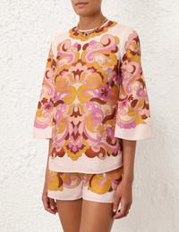 ITEM DETAILS The Acadian Tunic Top in Coral/Tan Paisley from our Resort Swim 2024 Collection. A linen tunic top featuring placement print and long sleeves. - Linen - Tunic style top - Wide flared sleeve - Placement print - Invisible zip at centre back Style Code: 8630TRS244 SIZE DETAILS 0P 0 1 2 3 Length 64 69 69 70 71 Bust 87 92 98 103 108 Sleeve 45 48 49 49 50 Relaxed fit This garment fits true to size Available in size 0P, suited to clients who are under 5'3"/ 160cm Model is 5'9.5"/178 cm, bust size 32C/10C and wears a size 0 Item measurements have been rounded to the nearest cm. CARE INSTRUCTIONS Main: 100% linen Contrast: 100% cotton Exclusive of trims Dry clean only code p Cool iron Do not spot clean Always check the garment care label for specific care instructions.
