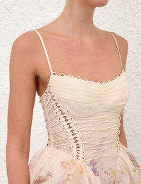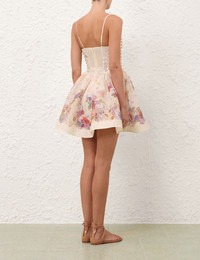 ITEM DETAILS The Alchemy Beaded Mini Dress in Cream Multi Floral from our Spring 2026 Collection, Kindred Spirit. A silk-linen mini dress featuring a fitted corset bodice with ruching, adjustable straps, finished with a full flare skirt and invisible zip closure. - Silk-linen blend fabric - Bust with internal boning - Rouleau lace up bodice with panels - Shirred elastic across back - Invisible centre back zip closure - Skirt has tulle underlayer - Rouleau beaded trim - Skirt is lined Style Code: 6913DS262 SIZE DETAILS 0P 0 1 2 3 4 Length 23 24.5 24.5 25 25 25.5 Bust 30 31.5 34 35.5 38 39.5 Waist 24.5 25 27.5 30 31.5 34 Fitted bodice with boning, relaxed through the skirt This garment fits true to size Available in size 0P, suited to clients who are under 5'3"/ 160cm Model is 5'9.5"/178 cm, bust size 32C/10C and wears a size 0 Item measurements are in inches CARE INSTRUCTIONS Main: 55% linen, 45% silk; lining: 100% cotton Dry clean only code f (hydrocarbon only); Remove any detachable trims prior to dry cleaning; Cover to protect trim; Iron in low temperature with protective cloth; Light steam only; Do not spot clean Always check the label or care card for specific care instructions.