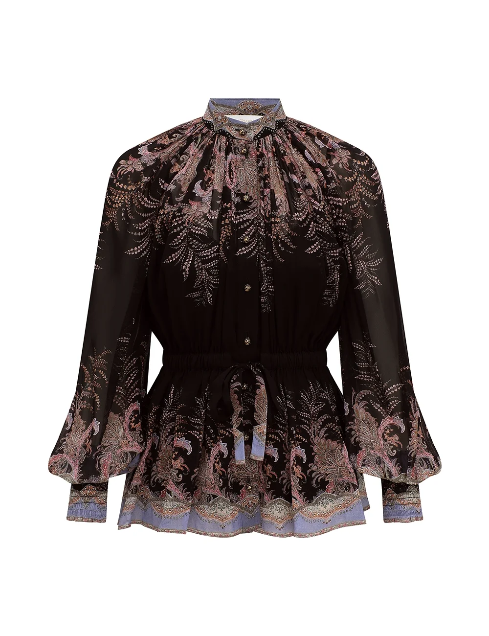 ITEM DETAILS The Alchemy Drawn Blouse in Black Paisley from our Spring 2026 Collection, Kindred Spirit. A blouse featuring a stand collar, long billow sleeves, finished with an elasticated drawstring waist and heavy gathering throughout. - Long sleeve blouse - Stand collar - Elasticated cuffs allows for flexible sleeve length - Centre front buttons - Elasticated waist with self-tie - Comes with a separate slip Style Code: 7889TS262 SIZE DETAILS 0P 0 1 2 3 4 Length 24 25.5 25.5 26 26.5 26.5 Bust 54.5 56.5 58.5 60.5 63 64.5 Waist 27 27.5 30 31.5 34 35.5 Sleeve 26 27.5 28 28.5 28.5 29 Elasticated waist for a flexible fit Mid-weight, non-stretchy fabric This garment fits true to size Available in size 0P, suited to clients who are under 5'3"/ 160cm Model is 5'9.5"/178 cm, bust size 32C/10C and wears a size 0 Item measurements are in inches CARE INSTRUCTIONS Main: 100% viscose; slip: 86% recycled polyester, 14% elastane Main: Dry clean only code f (hydrocarbon only); Remove any detachable trims prior to dry cleaning; Cover to protect trim; Iron in low temperature with protective cloth; Light steam only; Do not spot clean Slip: Gentle cold hand wash separately with mild detergent; Do not bleach; Dry in shade; Iron in low temperature with protective cloth; Do not tumble dry; Dry cleanable code f (hydrocarbon only); Always check the label or care card for specific care instructions.