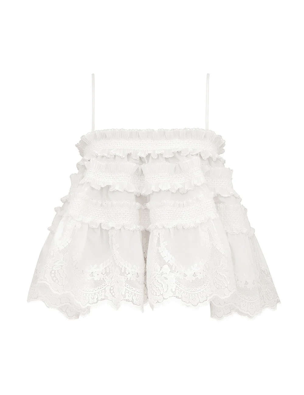 ITEM DETAILS The Alchemy Shirred Bandeau in Ivory from our Spring 2026 Collection, Kindred Spirit. A cotton bandeau top featuring a flared, frill design and spliced trim throughout. - Cotton fabric - Frilled neckline - Detachable, adjustable straps - Centre back invisible zip - Lace detailing throughout - Voluminous style Style Code: 8701TS262 SIZE DETAILS 0P 0 1 2 3 4 Length 13.5 14 14 14 14 14 Bust 30 32.5 34 36 38 40 Relaxed fit Mid-weight, non-stretchy fabric This garment fits true to size Available in size 0P, suited to clients who are under 5'3"/ 160cm Model is 5'9.5"/178 cm, bust size 32C/10C and wears a size 0 Item measurements are in inches CARE INSTRUCTIONS Main: 100% cotton; smocking: 64% polyester, 36% cotton; lace: 100% polyester; crinoline: 100% polyester Dry clean only code f (hydrocarbon only); Remove any detachable trims prior to dry cleaning; Cover to protect trim; Iron in low temperature with protective cloth; Light steam only; Do not spot clean Always check the label or care card for specific care instructions.