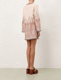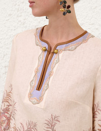 ITEM DETAILS The Alchemy Tunic Dress in Cream Paisley from our Spring 2026 Collection, Kindred Spirit. A linen mini dress featuring a deep V-neckline with gold chain detailing, long loose sleeves, finished with front pockets and an invisible centre back zip closure. - Linen fabric - V-neckline with chain detailing - Wide cuffs - Front patch pockets - Invisible centre back zip - Contrast faux leather trim throughout Style Code: 7940DS262 SIZE DETAILS 0P 0 1 2 3 4 Length 30.5 32.5 32.5 33.5 34.5 34.5 Bust 35.5 38 39.5 41.5 44 45.5 Sleeve 22 23.5 24 24 24.5 25 Relaxed fit This garment fits true to size Available in size 0P, suited to clients who are under 5'3"/ 160cm Model is 5'9.5"/178 cm, bust size 32C/10C and wears a size 0 Item measurements are in inches CARE INSTRUCTIONS Main: 100% linen; trim: 100% polyurethane; pocketing: 100% cotton Dry clean only code f (hydrocarbon only); Remove any detachable trims prior to dry cleaning; Cover to protect trim; Iron in low temperature with protective cloth; Light steam only; Do not spot clean Always check the label or care card for specific care instructions.