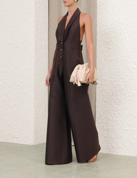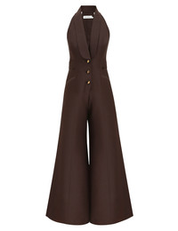 ITEM DETAILS The Alchemy Tuxedo Jumpsuit in Dark Chocolate from our Spring 2026 Collection, Kindred Spirit. A wool-silk jumpsuit featuring a waistcoat style bodice, halter neckline, centre front buttons, finished with a slim racer back and wide flared hem. - Wool-silk blend fabric - Sleeveless, full-length jumpsuit - Deep V-neckline with lapel - Front welt pockets - Centre front buttons with fly closure - Invisible left-side zip - Back waist belt Style Code: 7387US262 SIZE DETAILS 0P 0 1 2 3 4 Length 58.5 63.5 64 64.5 65 65.5 Waist 27.5 28.5 30.5 32.5 34.5 36 Hip 34 36 38 40 41.5 44 Inseam 31 34.5 34.5 34.5 34.5 34.5 Tailored, relaxed fit Full-length pant with a wide leg This garment fits true to size Available in size 0P, suited to clients who are under 5'3"/ 160cm Model is 5'9.5"/178 cm, bust size 32C/10C and wears a size 0 Item measurements are in inches CARE INSTRUCTIONS Main: 91% wool, 9% silk; lining: 75% viscose, 25% silk Dry clean only code f (hydrocarbon only); Remove any detachable trims prior to dry cleaning; Cover to protect trim; Iron in low temperature with protective cloth; Light steam only; Do not spot clean Always check the label or care card for specific care instructions.