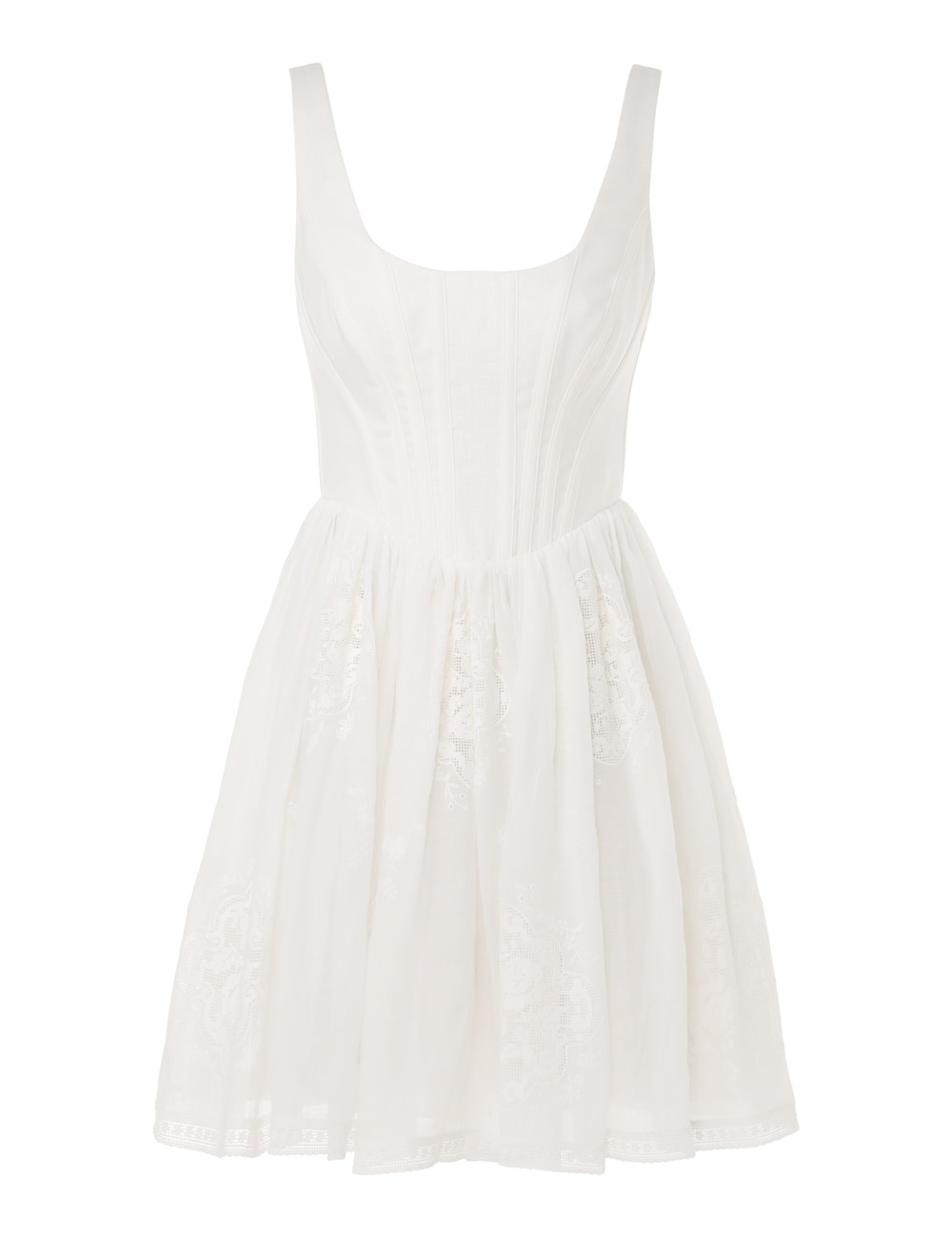 ITEM DETAILS The Alight Corset Mini Dress in Ivory from our Resort Swim 2024 Collection. A ramie mini dress featuring a corset bodice with boning. - Ramie mini dress - Shirring at centre back bodice - Wide straps - Side seam pockets - Invisible zipper at centre back - Lined Style Code: 8467DRS241 SIZE DETAILS 0P 0 1 2 3 4 Length 55 60 60 61 62 63 Bust 82 86 92 96 102 108 Waist 68 72 76 82 86 92 Fitted at the bodice This garment fits true to size Available in size 0P, suited to clients who are under 5'3"/ 160cm Model is 5'7.5"/175 cm, bust size 32C/10C and wears a size 0 Item measurements have been rounded to the nearest cm. CARE INSTRUCTIONS Main: 100% ramie Contrast: 100% linen Lining 100% cotton Trim: 100% ramie Embroidery: 100% cotton Exclusive of trims Dry clean only code f with protective bag Cool iron with protective cloth Do not spot clean Turn garment inside out before dry cleaning Always check the garment care label for specific care instructions.