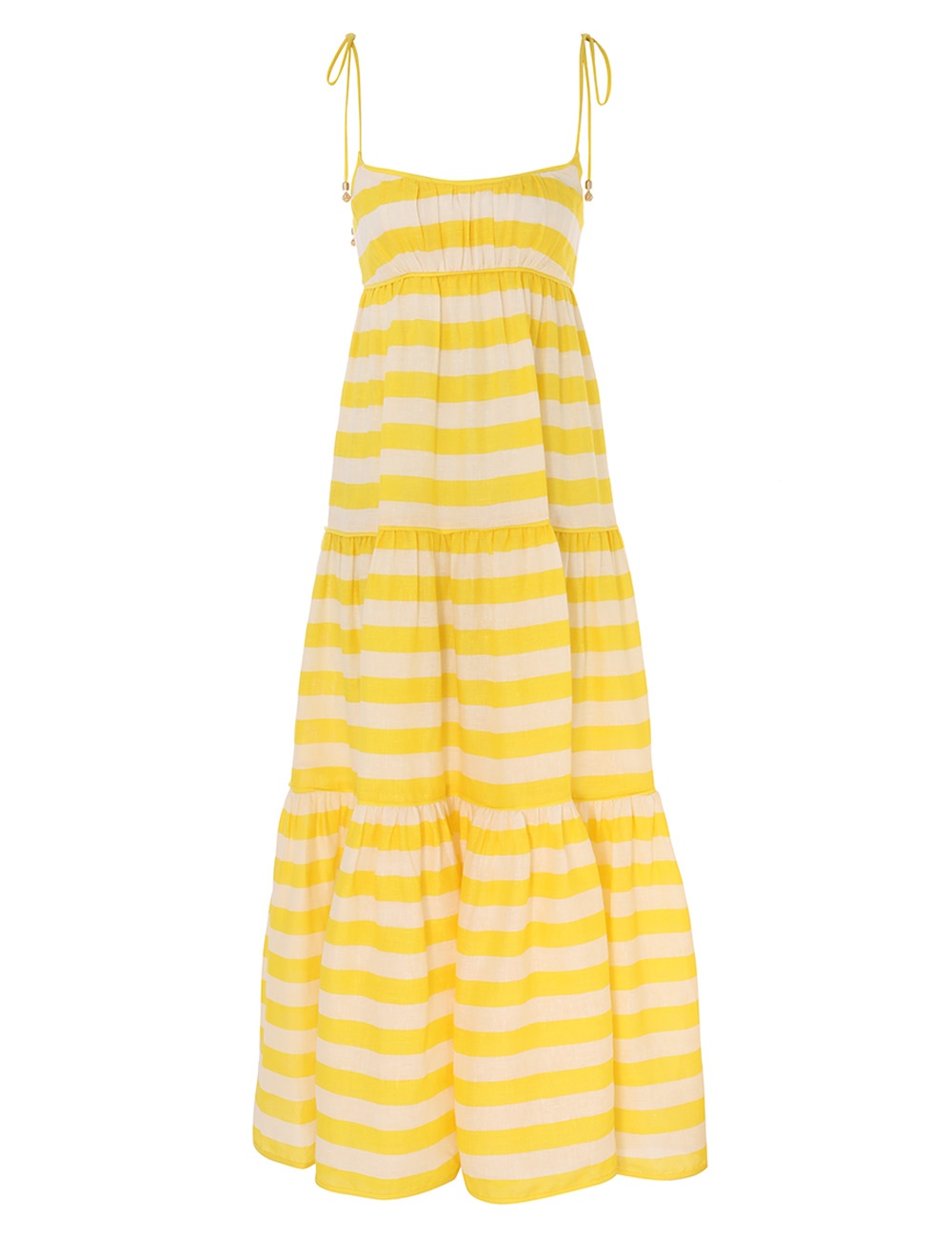 ITEM DETAILS The Alight Tie Shoulder Dress in Yellow/Cream Stripe from our Resort Swim 2024 Collection. A linen tiered midi dress featuring a gathered bodice with tassel end tie straps. - Linen midi dress - Placement stripe print - Centre back shirring - Invisible zip at centre back with hook and eye - Side seam boning - Lined Style Code: 8466DRS241 SIZE DETAILS 0P 0 1 2 3 4 Length 104 113 113 113 113 113 Bust 76 80 84 90 96 100 Centre back shirring for an easy fit This garment fits true to size Available in size 0P, suited to clients who are under 5'3"/ 160cm Model is 5'7.5"/175 cm, bust size 32C/10C and wears a size 0 Item measurements have been rounded to the nearest cm. CARE INSTRUCTIONS Main: 100% linen Lining 100% cotton Exclusive of trims Dry clean only code p with protective bag Cool iron Do not spot clean Always check the garment care label for specific care instructions.